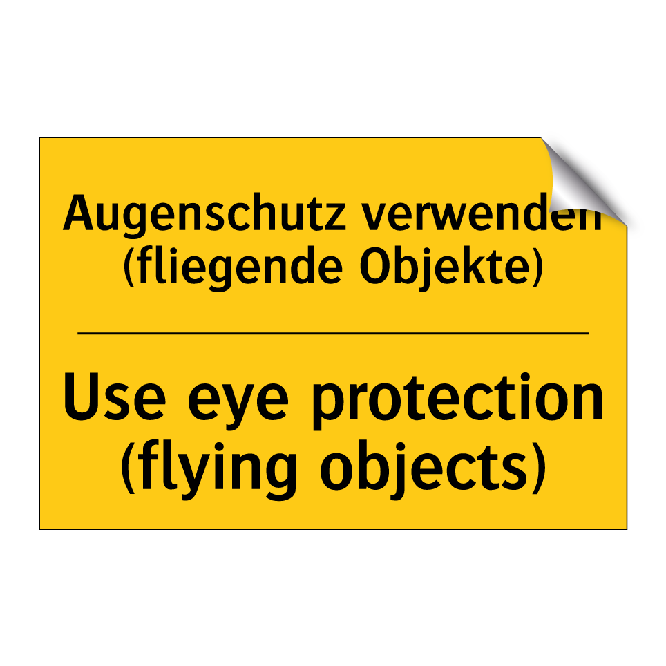 Zweisprachiges Warnschild mit deutschem Text Augenschutz verwenden (fliegende Objekte) und englischem Text Use eye protection (flying objects)