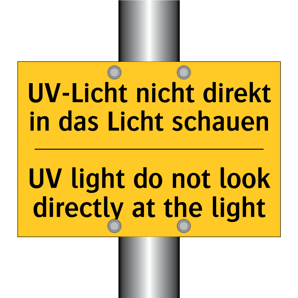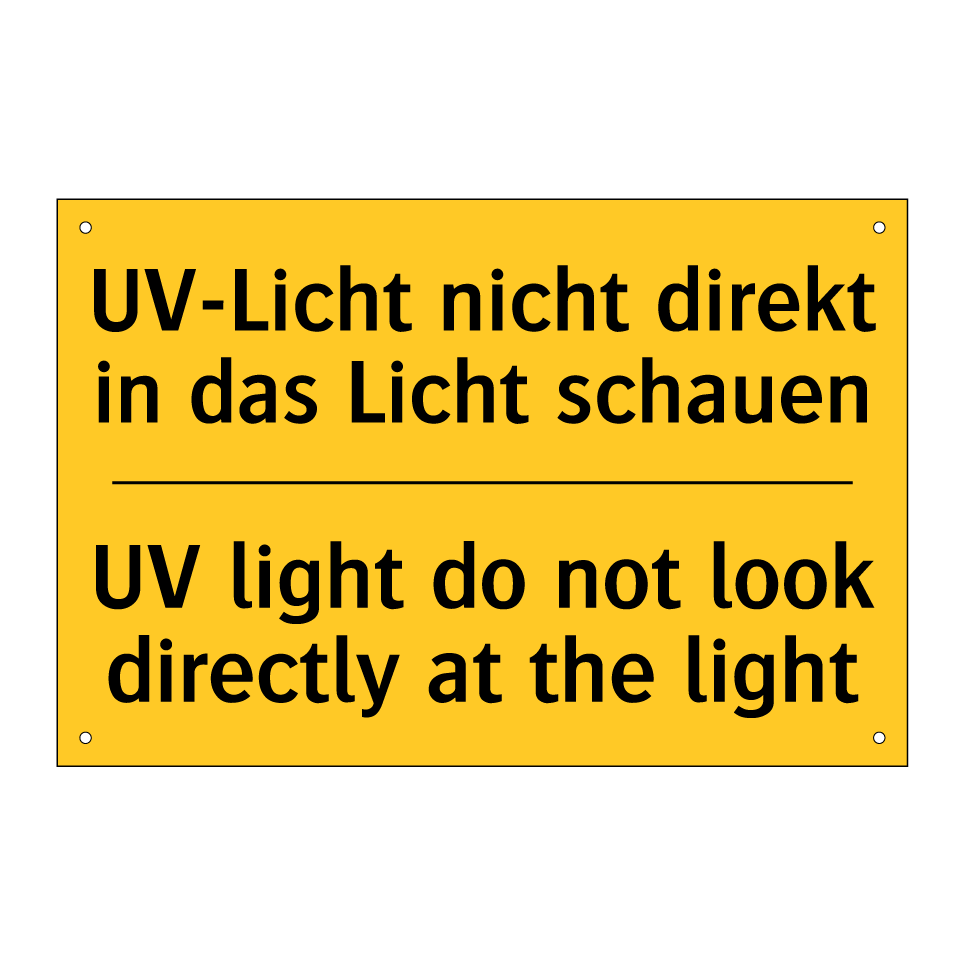 Zweisprachiges Warnschild mit deutschem Text UV-Licht nicht direkt in das Licht schauen und englischem Text UV light do not look directly at the light