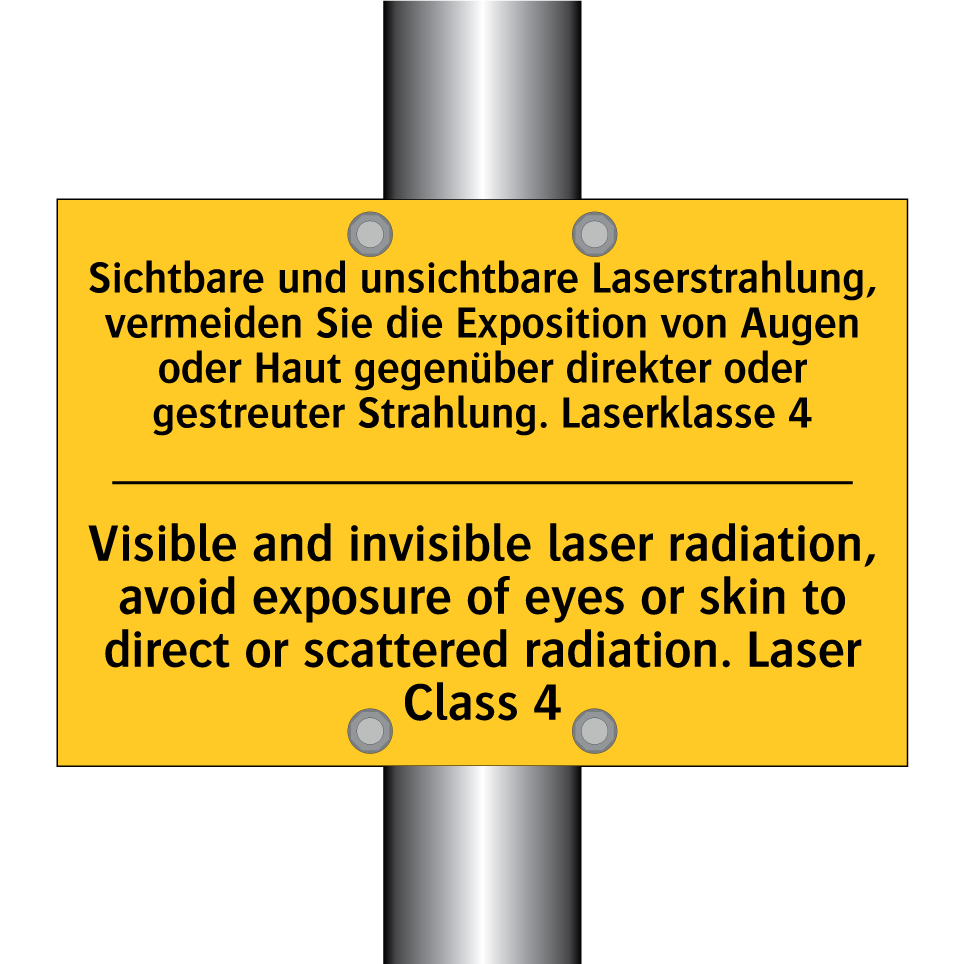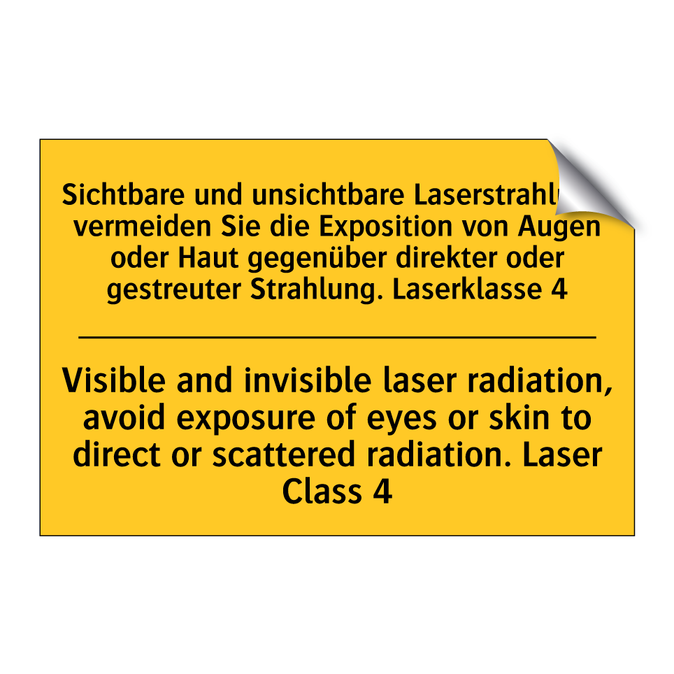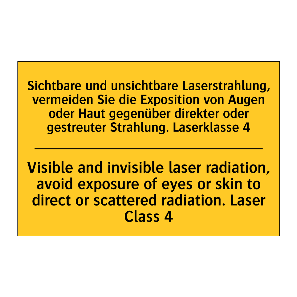 Zweisprachiges Warnschild mit deutschem Text Sichtbare und unsichtbare Laserstrahlung, vermeiden Sie die Exposition von Augen oder Haut gegenüber direkter oder gestreuter Strahlung. Laserklasse 4 und englischem Text Visible and invisible laser radiation, avoid exposure of eyes or skin to direct or scattered radiation. Laser Class 4