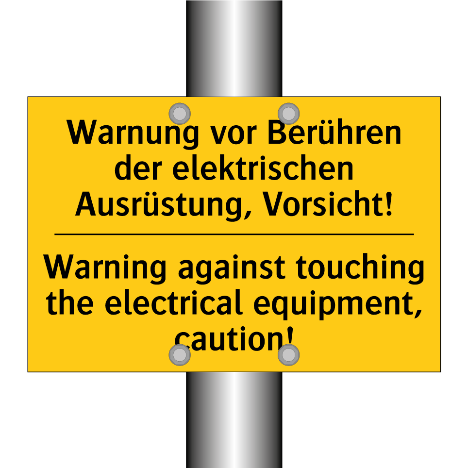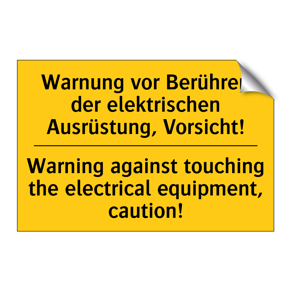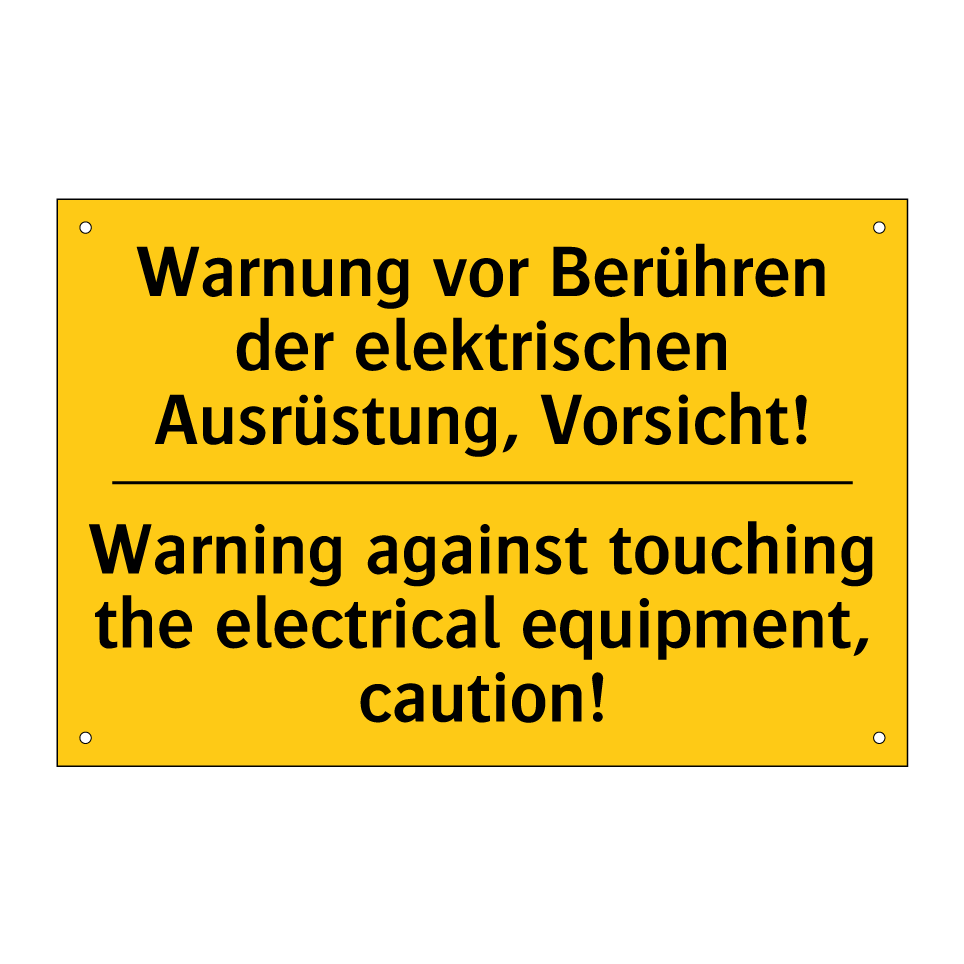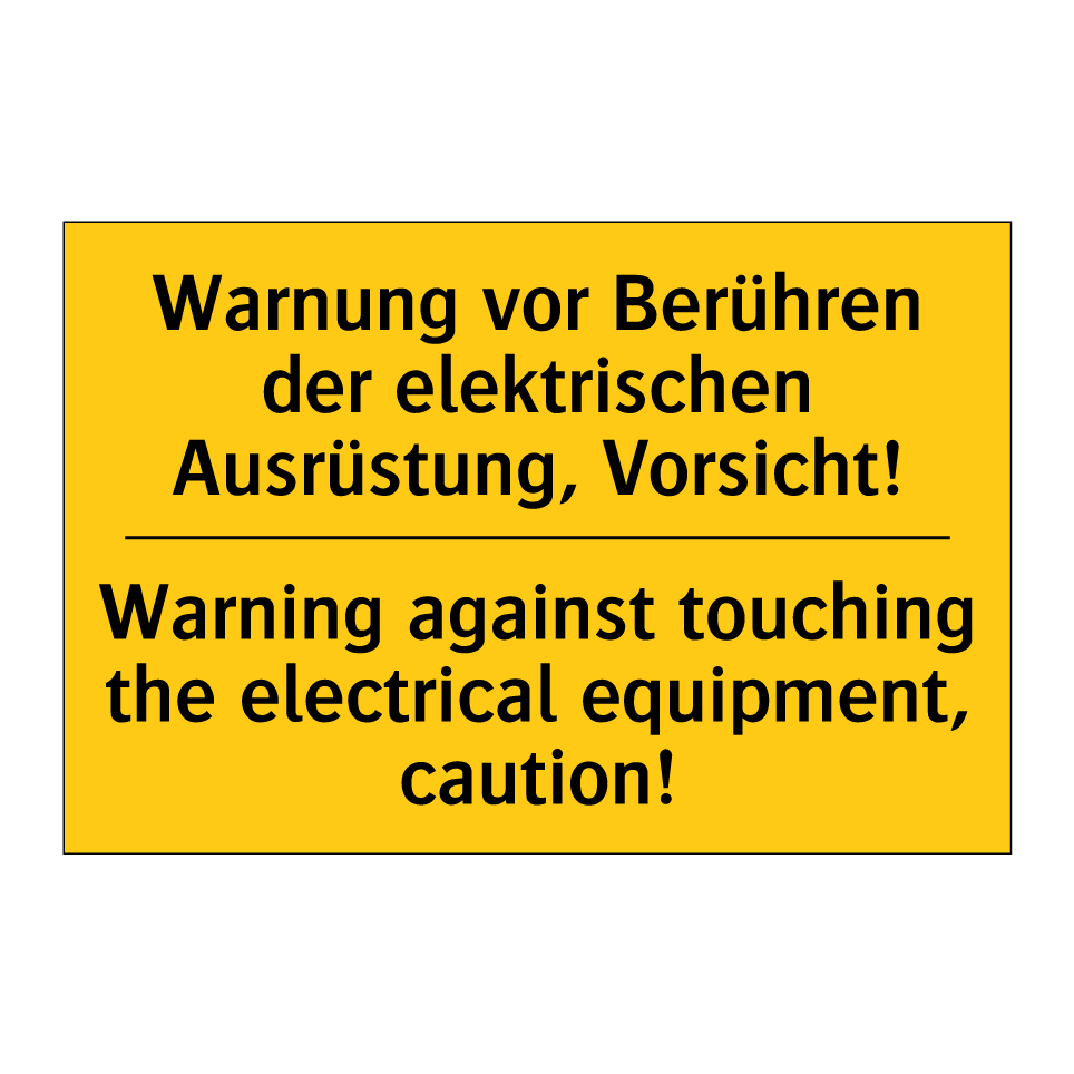 Zweisprachiges Warnschild mit deutschem Text Warnung vor Berühren der elektrischen Ausrüstung, Vorsicht! und englischem Text Warning against touching the electrical equipment, caution!