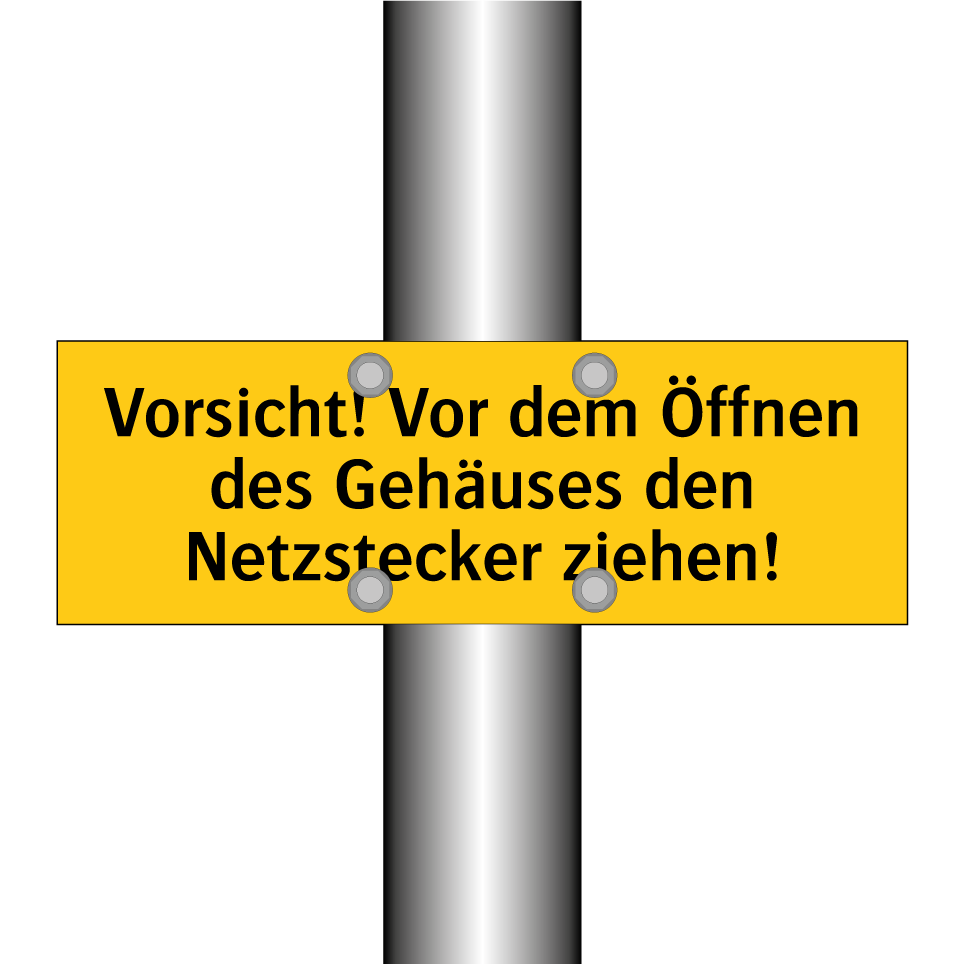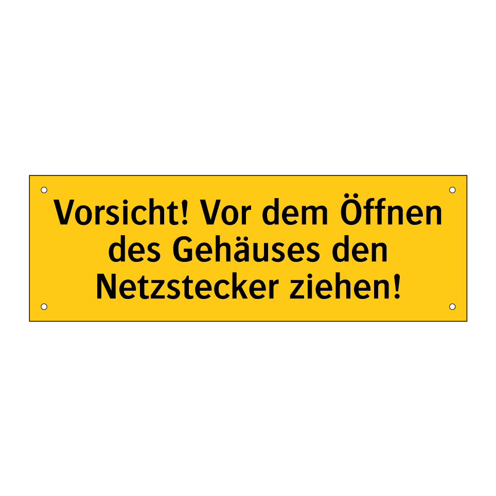 Warnschild mit dem Text Vorsicht! Vor dem Öffnen des Gehäuses den Netzstecker ziehen!