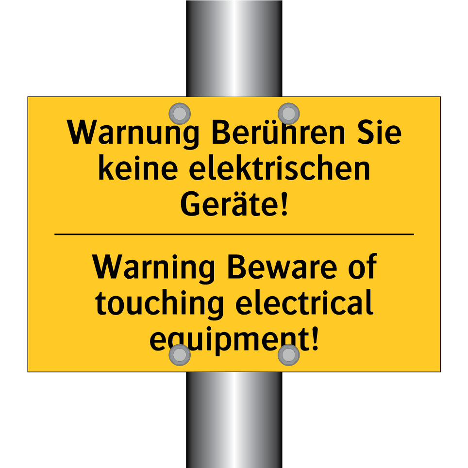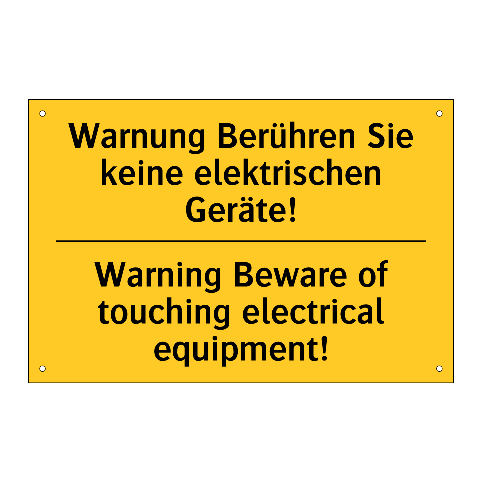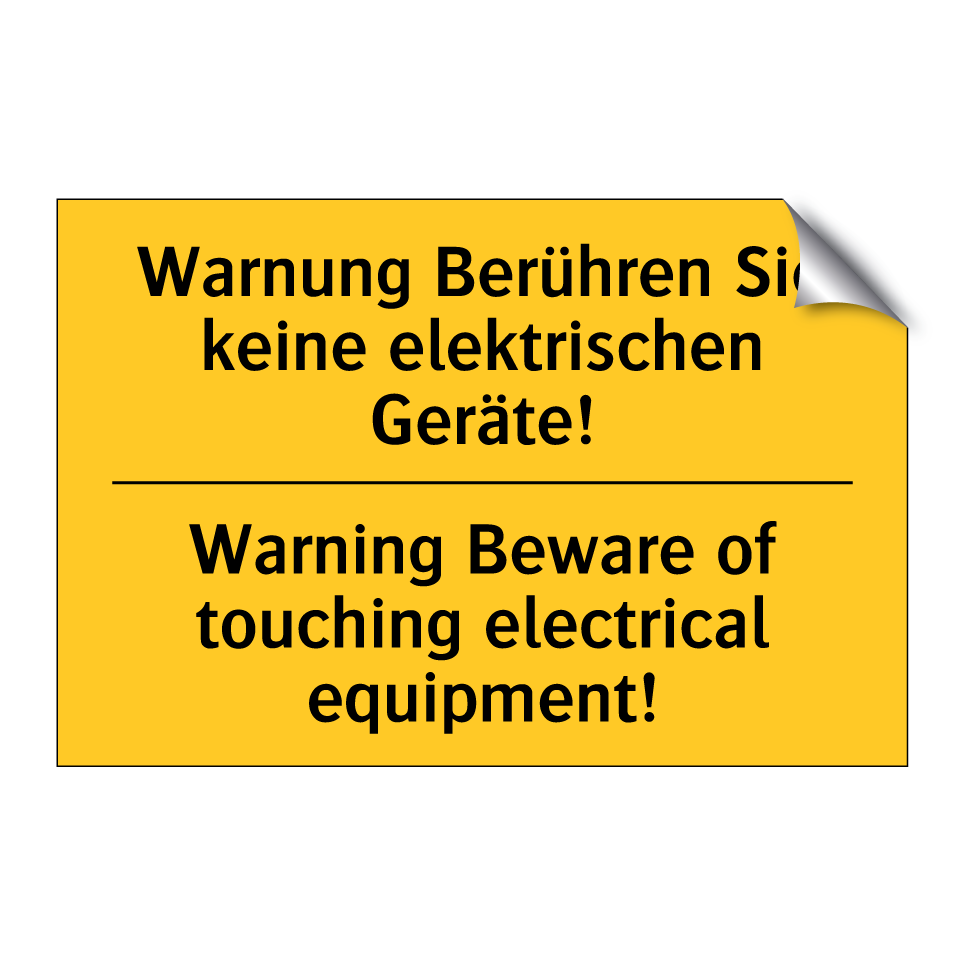 Zweisprachiges Warnschild mit deutschem Text Warnung Berühren Sie keine elektrischen Geräte! und englischem Text Warning Beware of touching electrical equipment!
