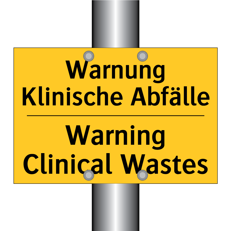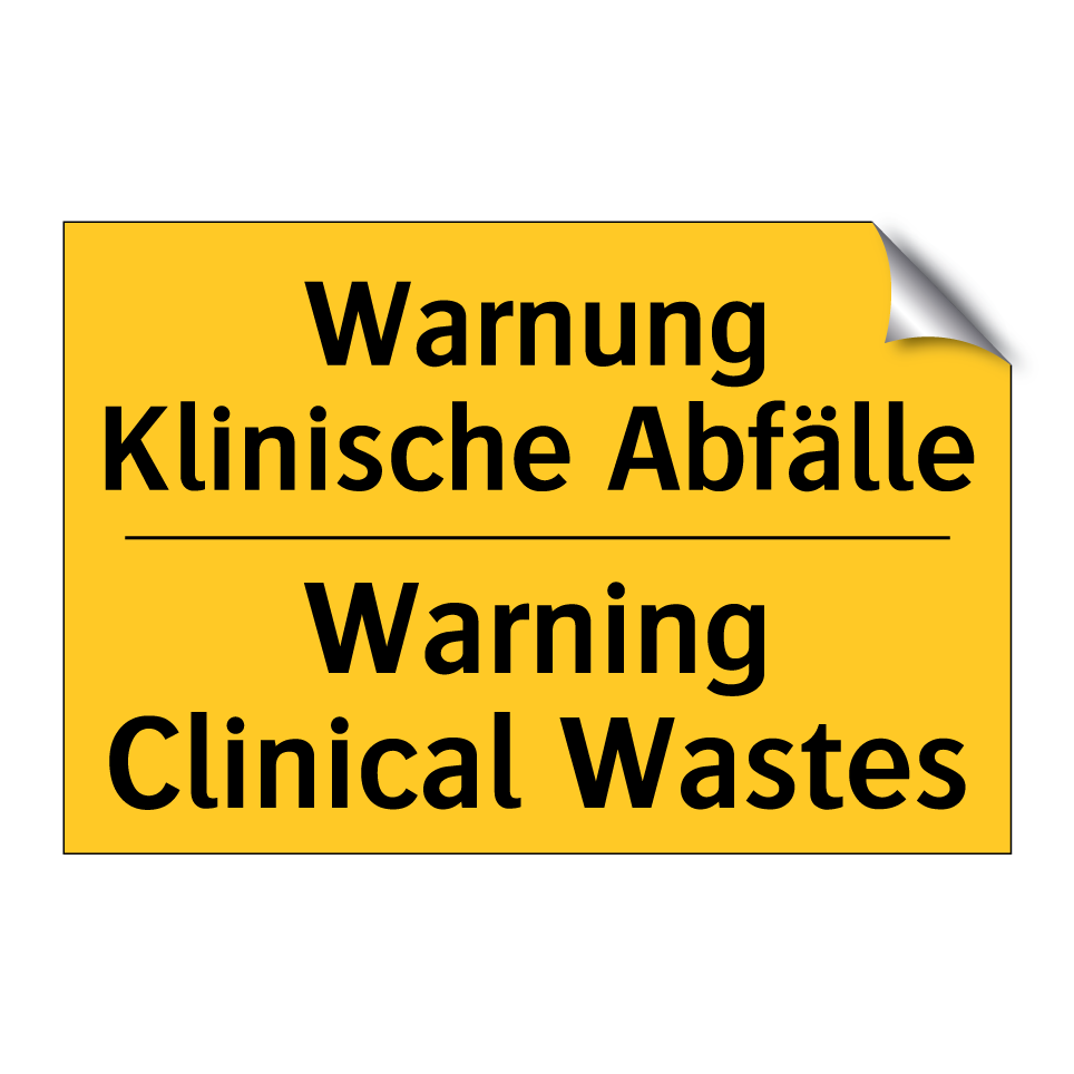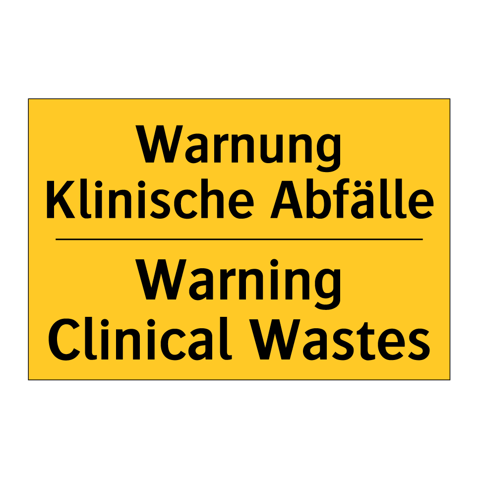 Zweisprachiges Warnschild mit deutschem Text Warnung Klinische Abfälle und englischem Text Warning Clinical Wastes