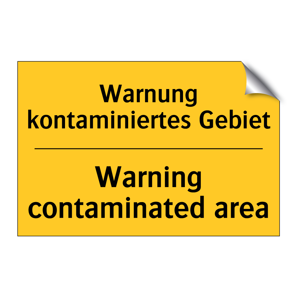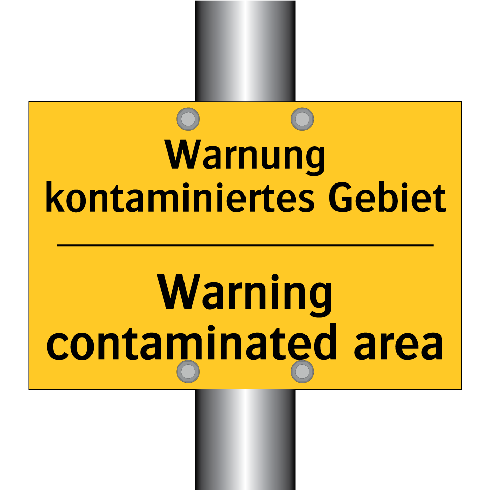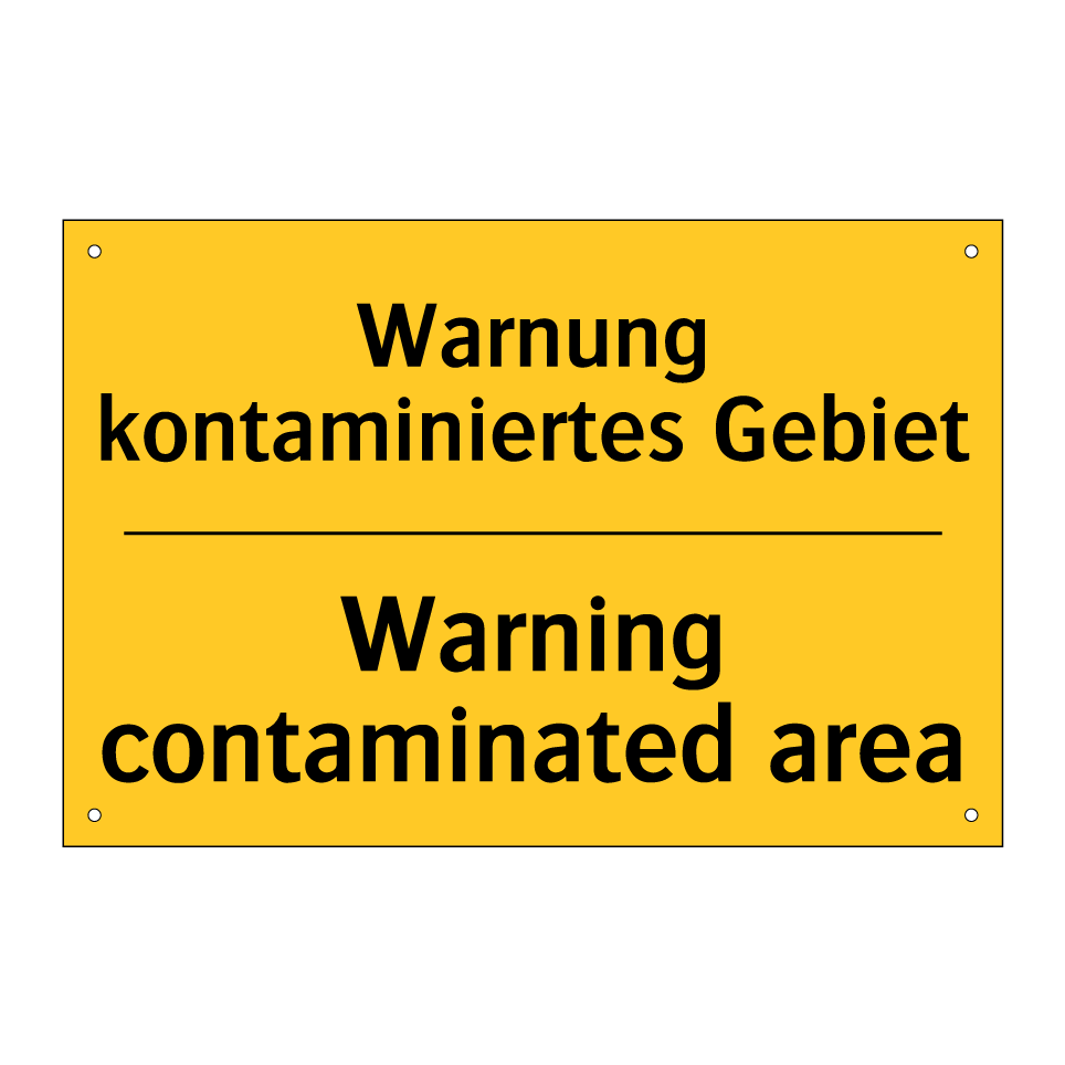 Zweisprachiges Warnschild mit deutschem Text Warnung kontaminiertes Gebiet und englischem Text Warning contaminated area