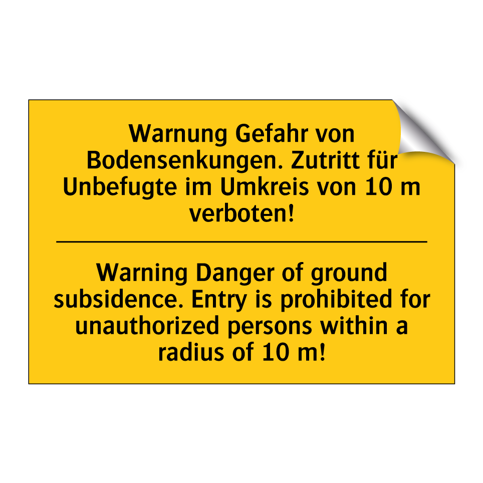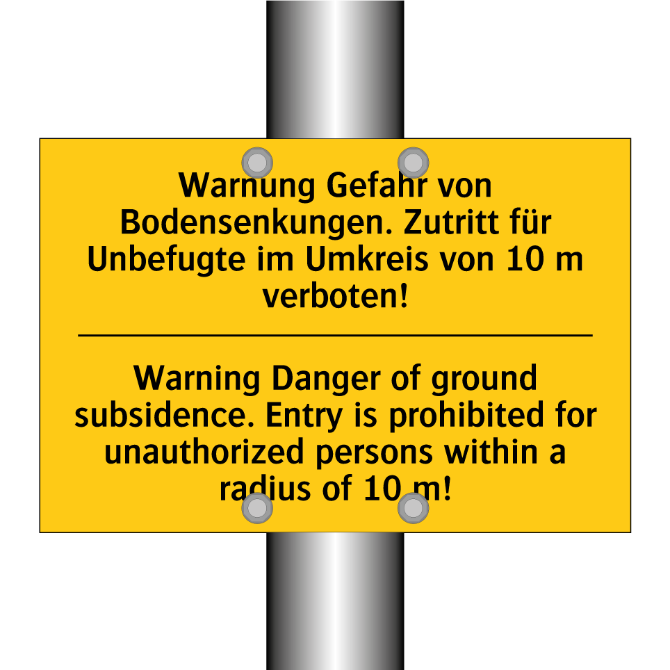 Zweisprachiges Warnschild mit deutschem Text Warnung Gefahr von Bodensenkungen. Zutritt für Unbefugte im Umkreis von 10 m verboten! und englischem Text Warning Danger of ground subsidence. Entry is prohibited for unauthorized persons within a radius of 10 m!