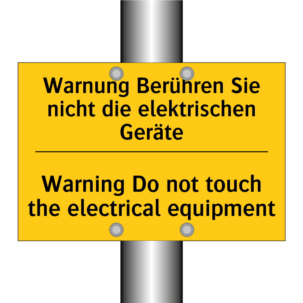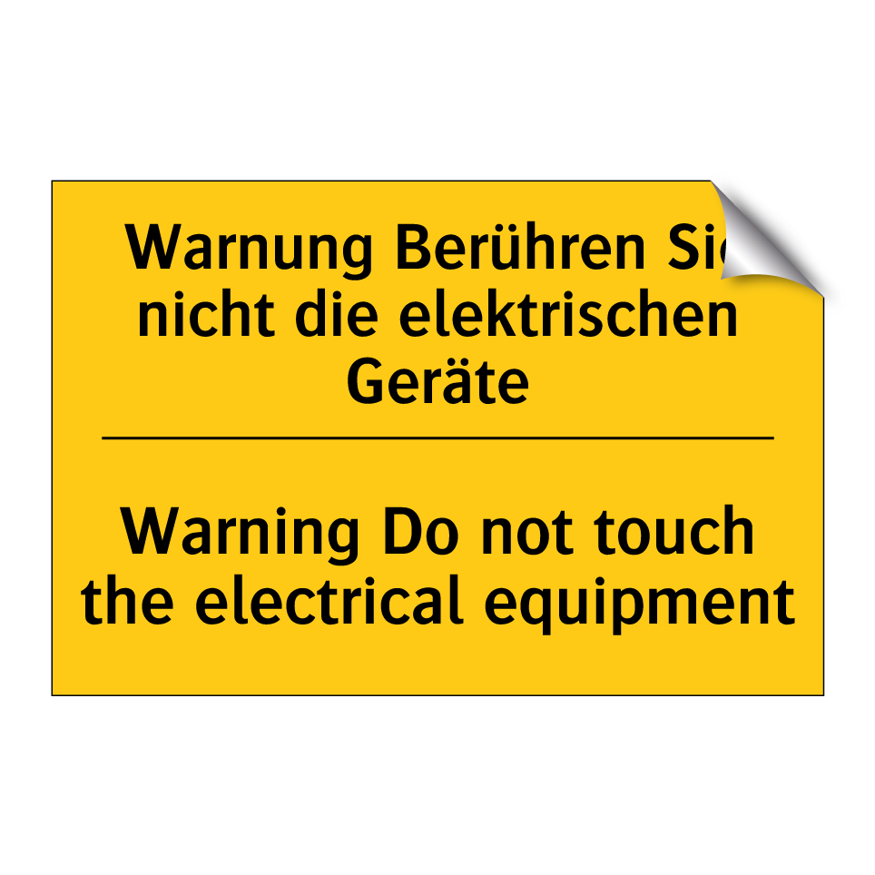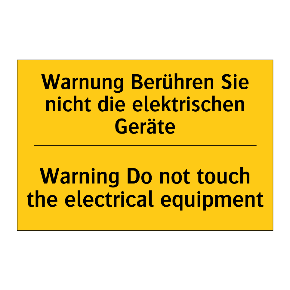 Zweisprachiges Warnschild mit deutschem Text Warnung Berühren Sie nicht die elektrischen Geräte und englischem Text Warning Do not touch the electrical equipment
