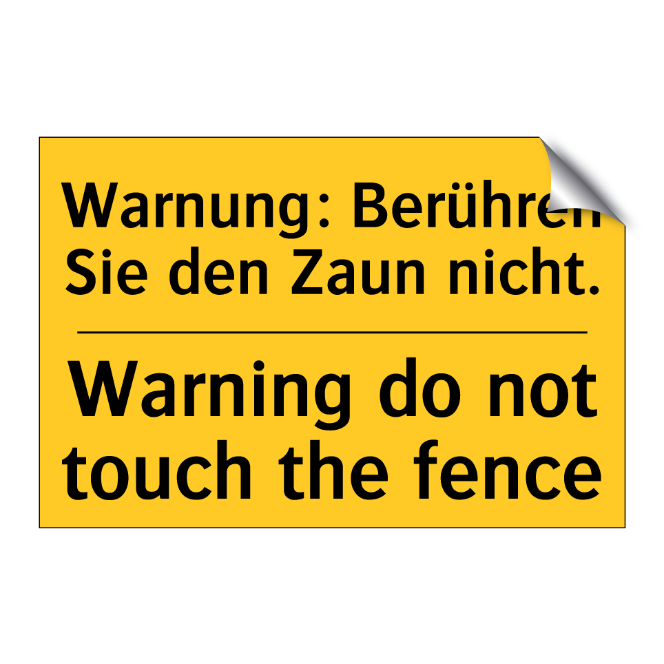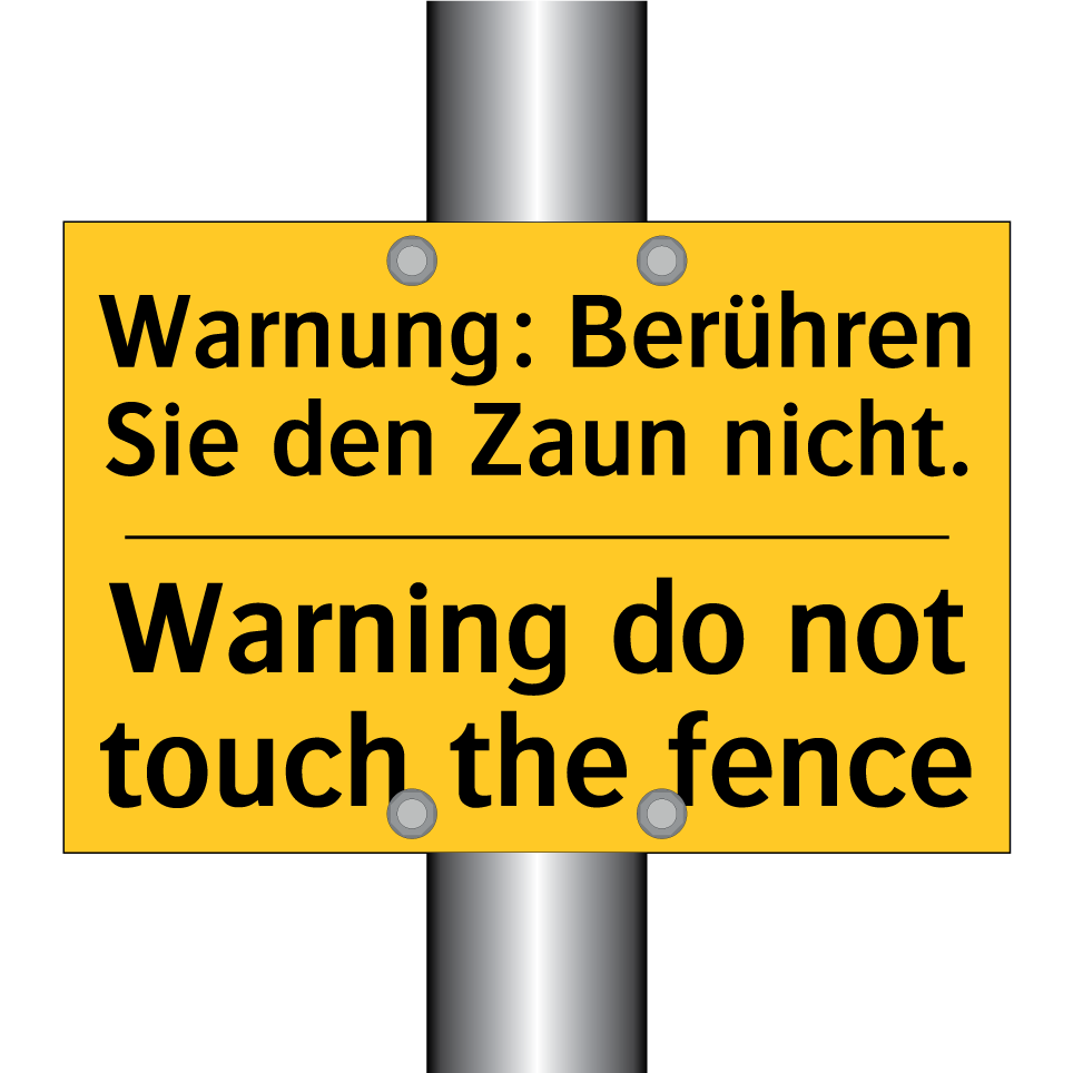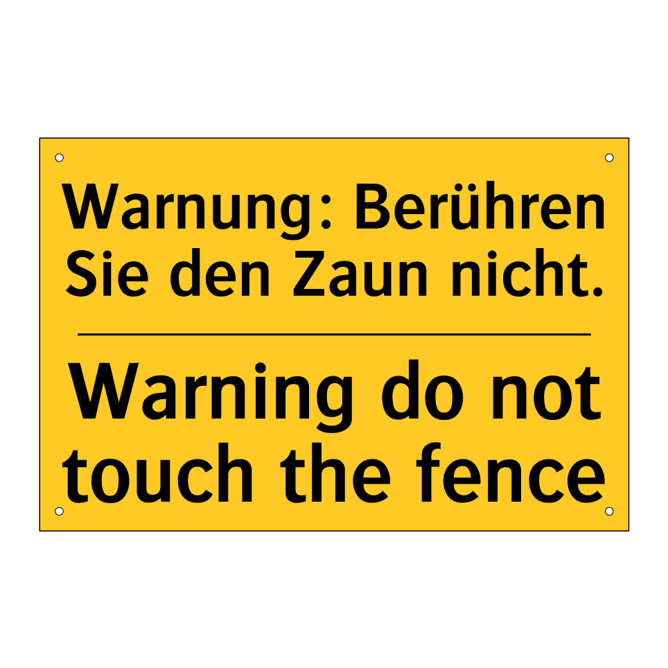 Zweisprachiges Warnschild mit deutschem Text Warnung: Berühren Sie den Zaun nicht. und englischem Text Warning do not touch the fence