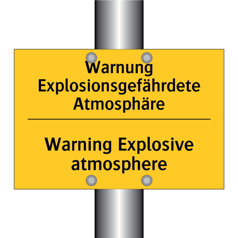 Zweisprachiges Warnschild mit deutschem Text Warnung Explosionsgefährdete Atmosphäre und englischem Text Warning Explosive atmosphere