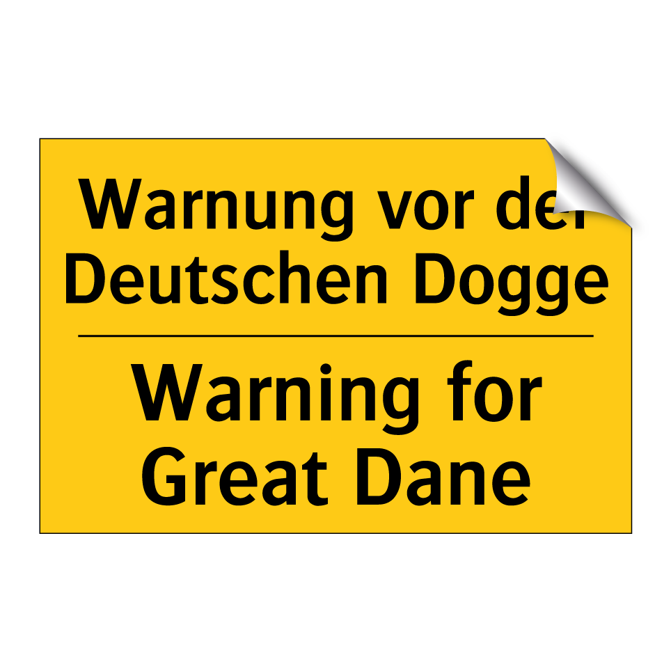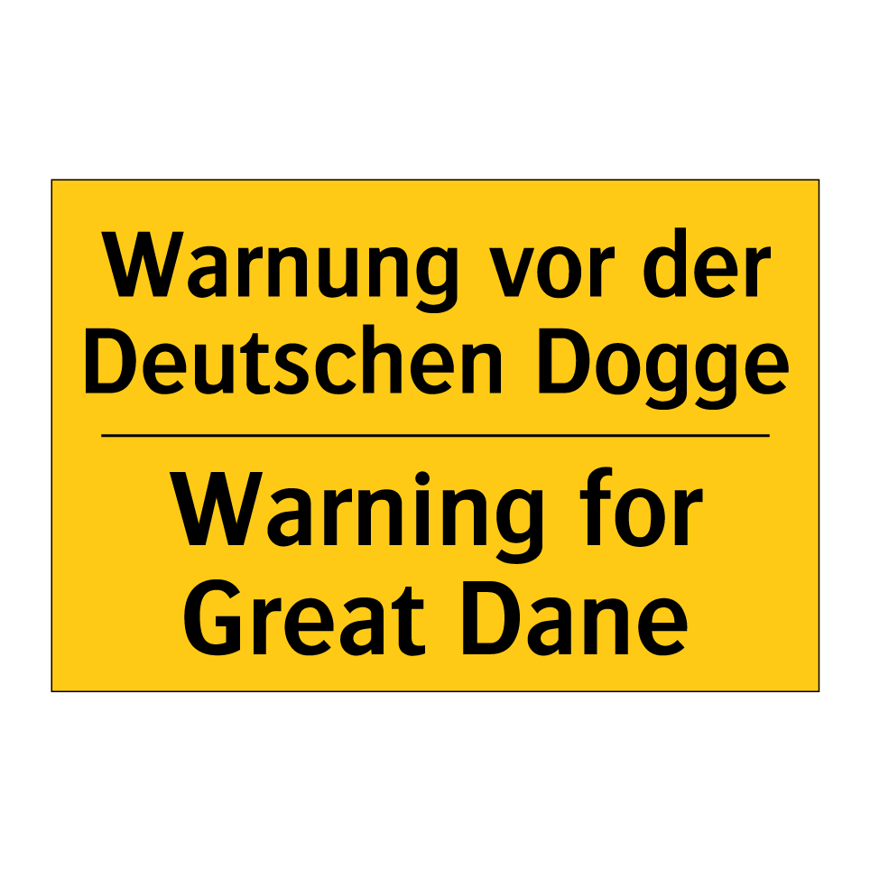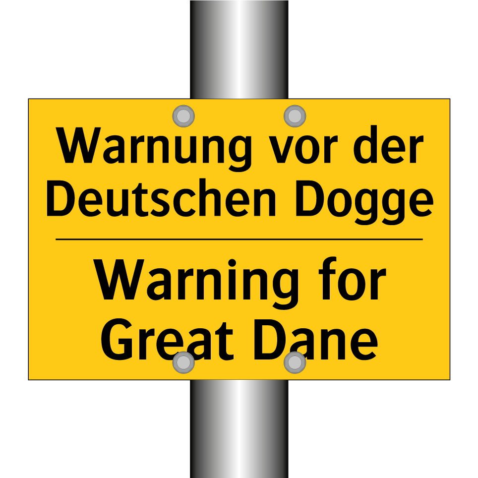 Zweisprachiges Warnschild mit deutschem Text Warnung vor der Deutschen Dogge und englischem Text Warning for Great Dane