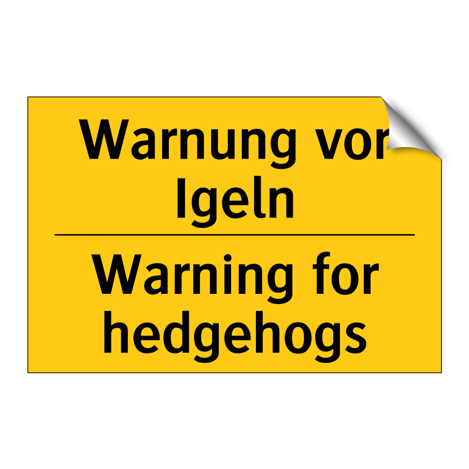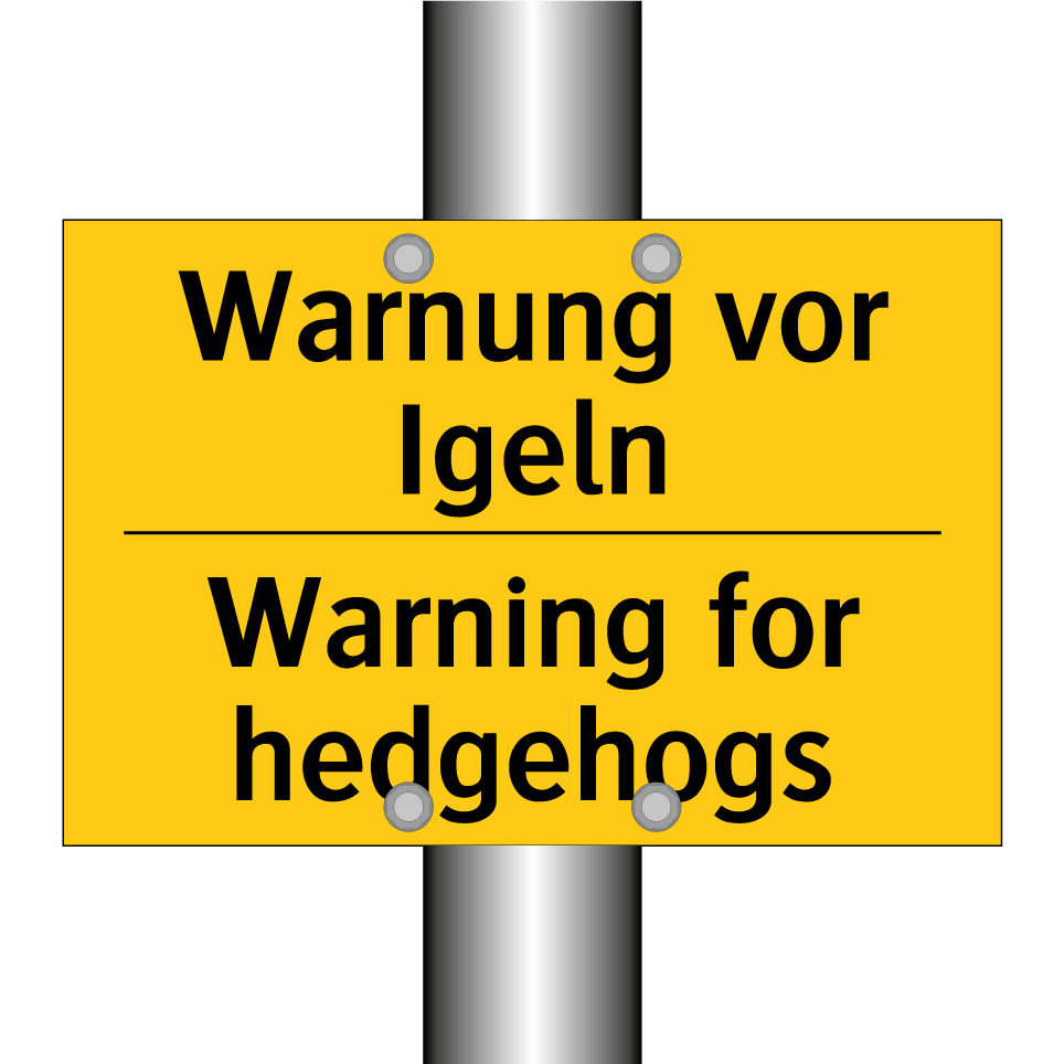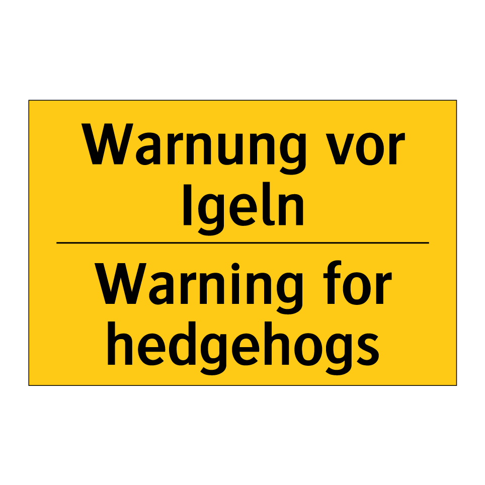 Zweisprachiges Warnschild mit deutschem Text Warnung vor Igeln und englischem Text Warning for hedgehogs