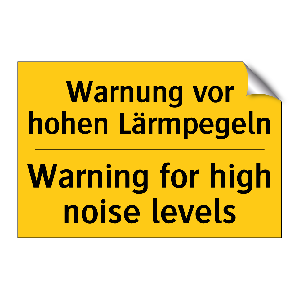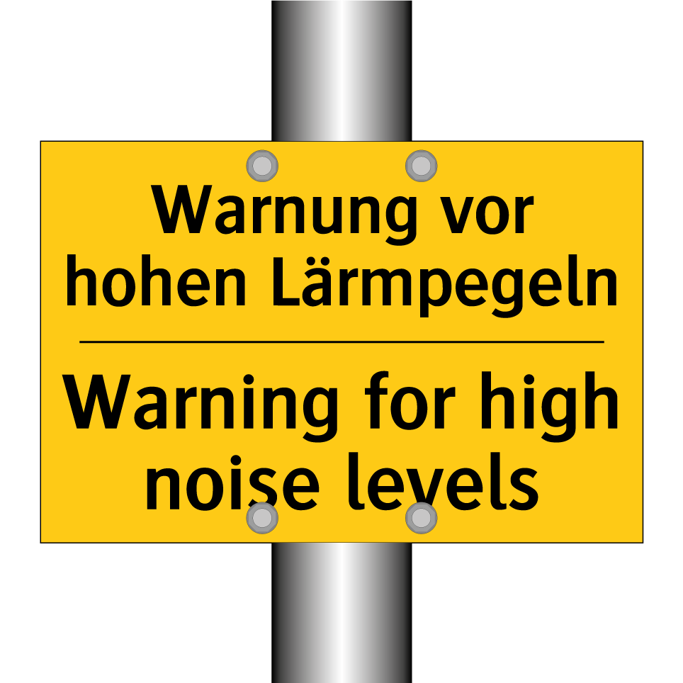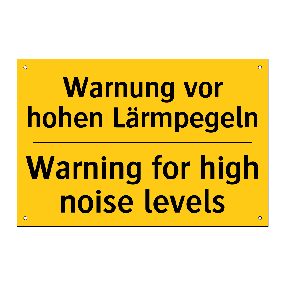 Zweisprachiges Warnschild mit deutschem Text Warnung vor hohen Lärmpegeln und englischem Text Warning for high noise levels