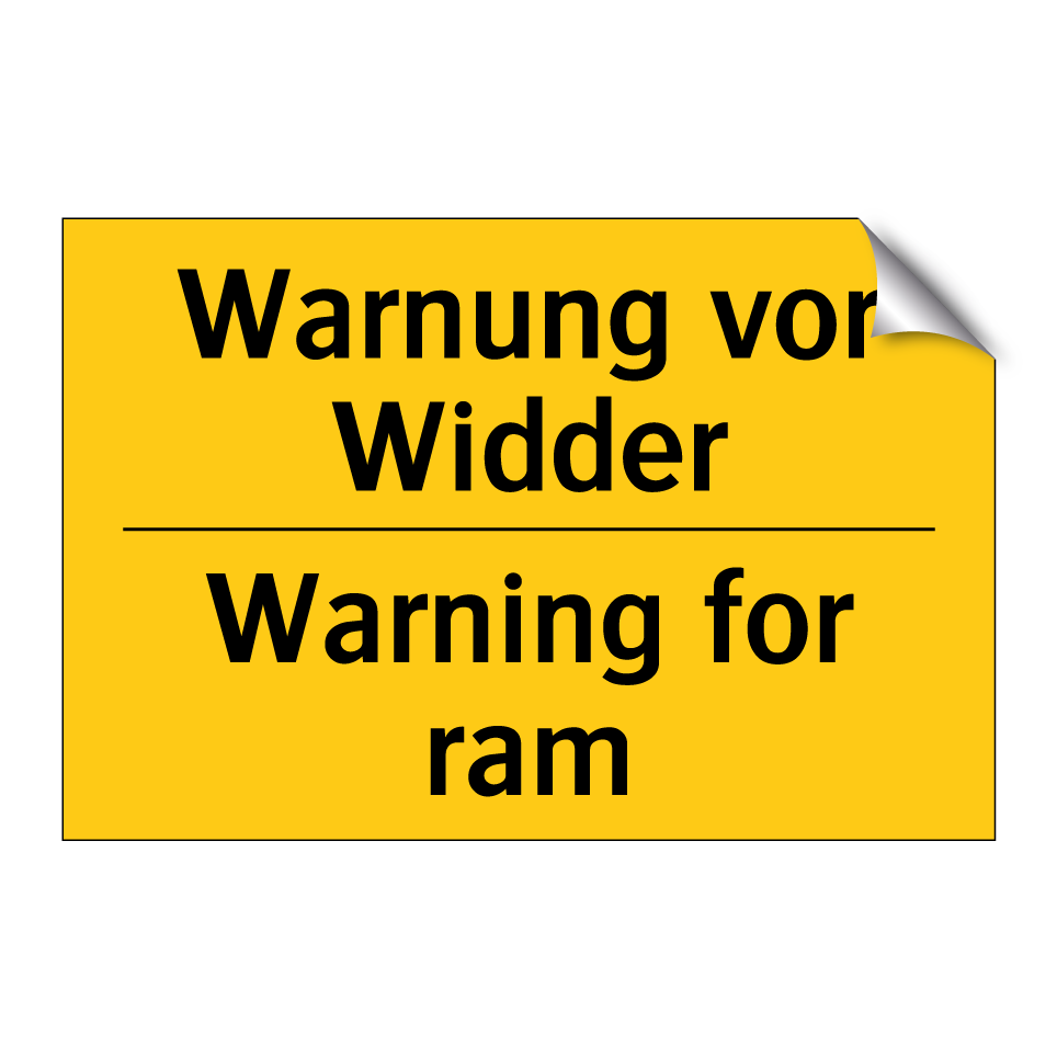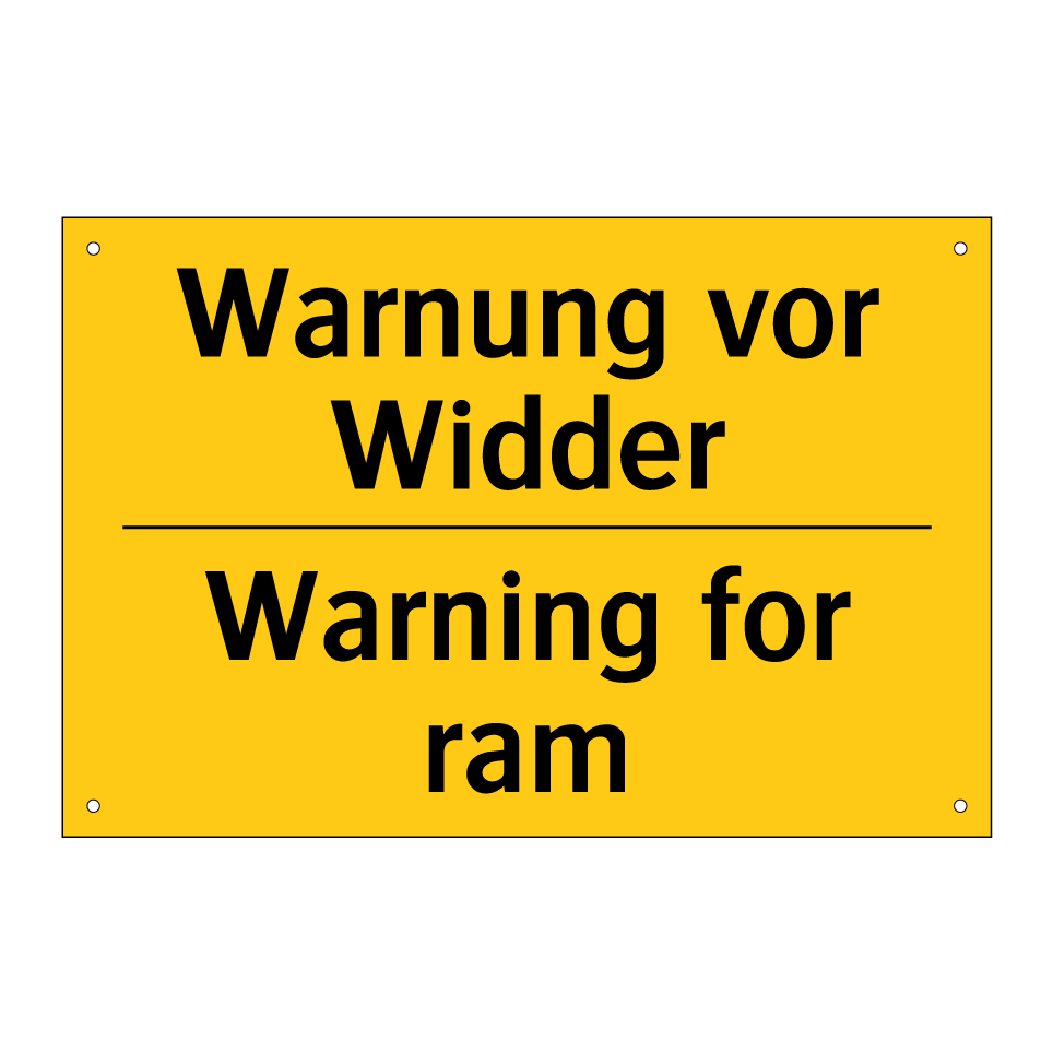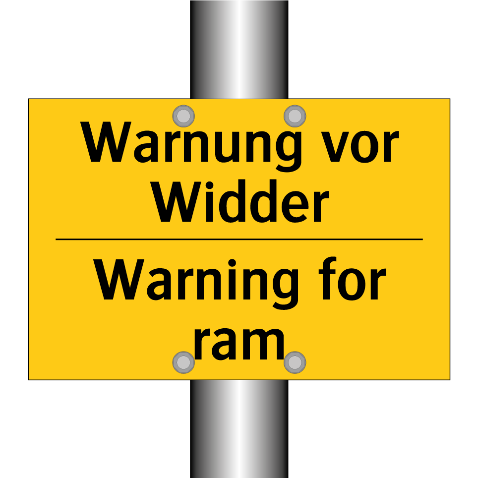 Zweisprachiges Warnschild mit deutschem Text Warnung vor Widder und englischem Text Warning for ram