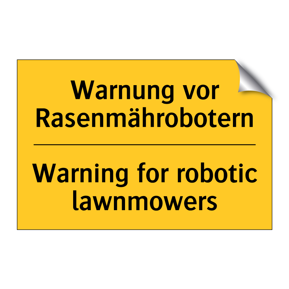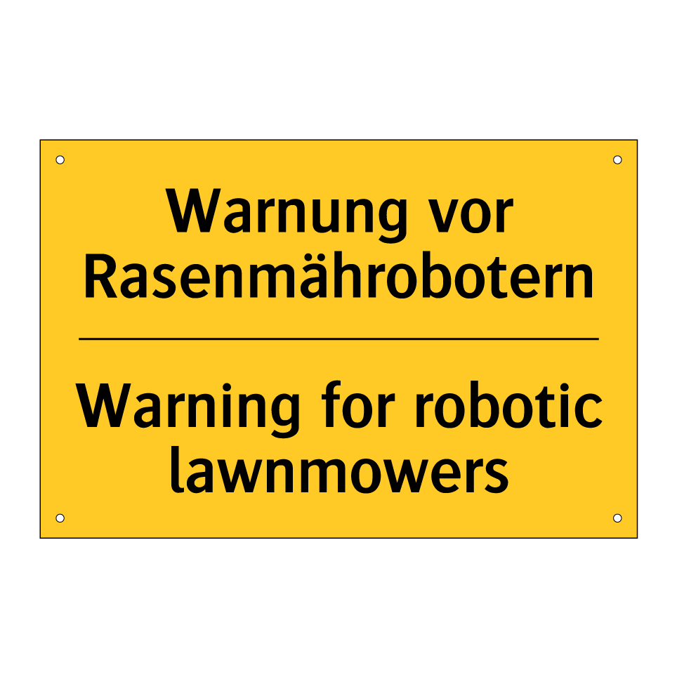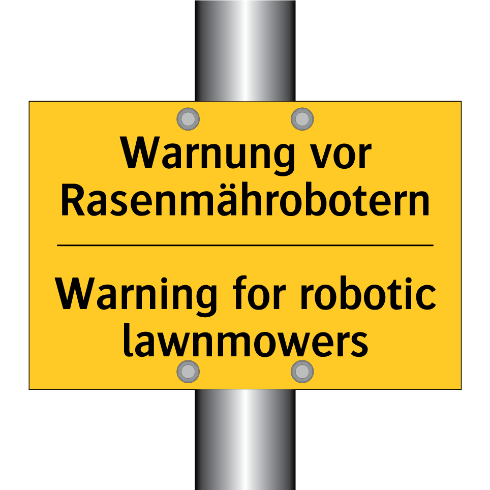 Zweisprachiges Warnschild mit deutschem Text Warnung vor Rasenmährobotern und englischem Text Warning for robotic lawnmowers