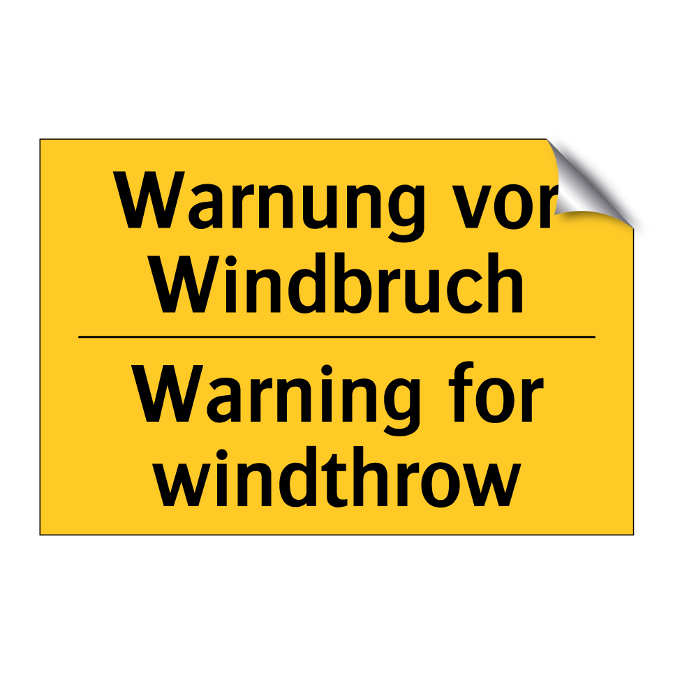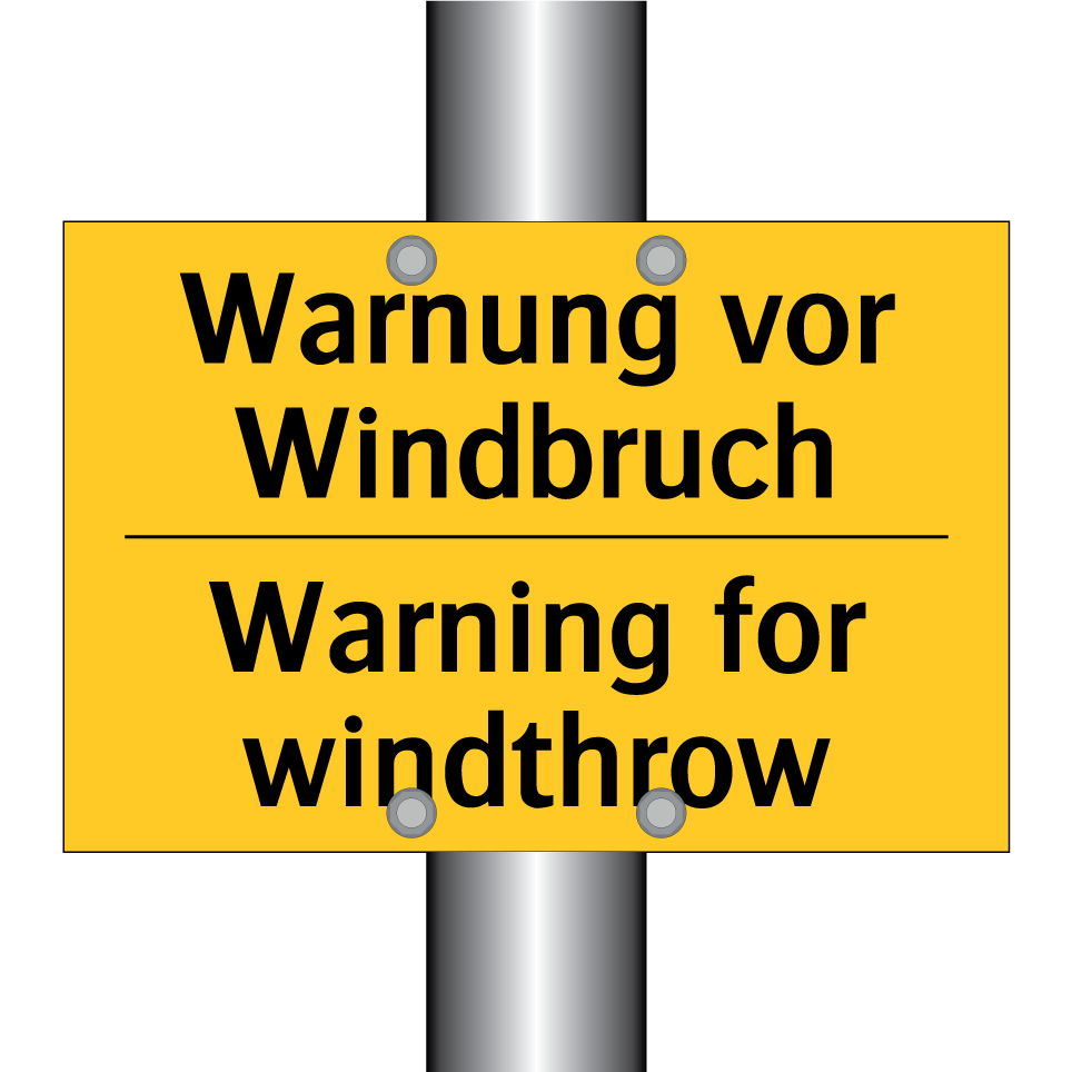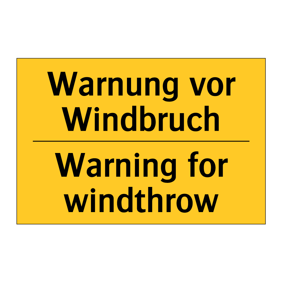 Zweisprachiges Warnschild mit deutschem Text Warnung vor Windbruch und englischem Text Warning for windthrow