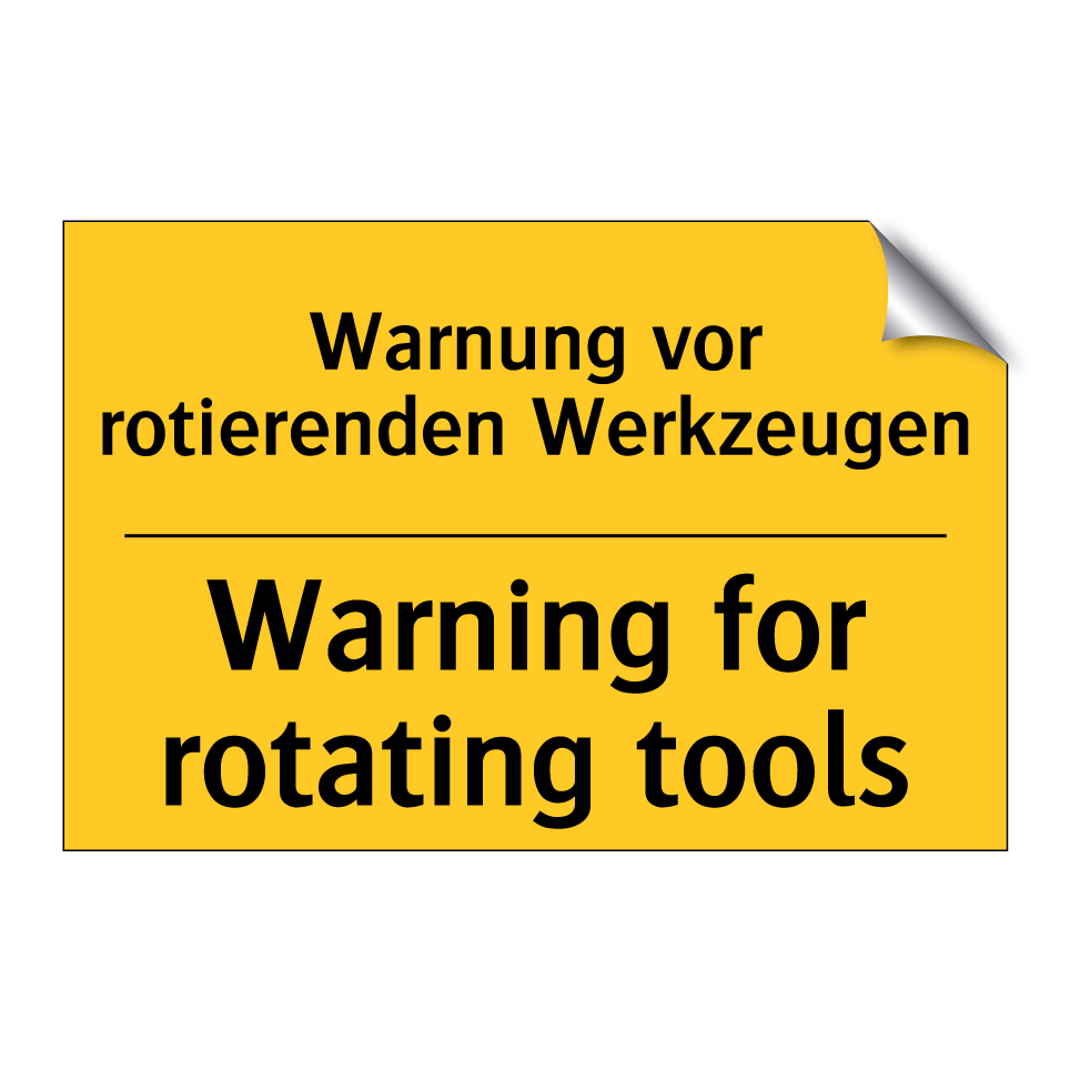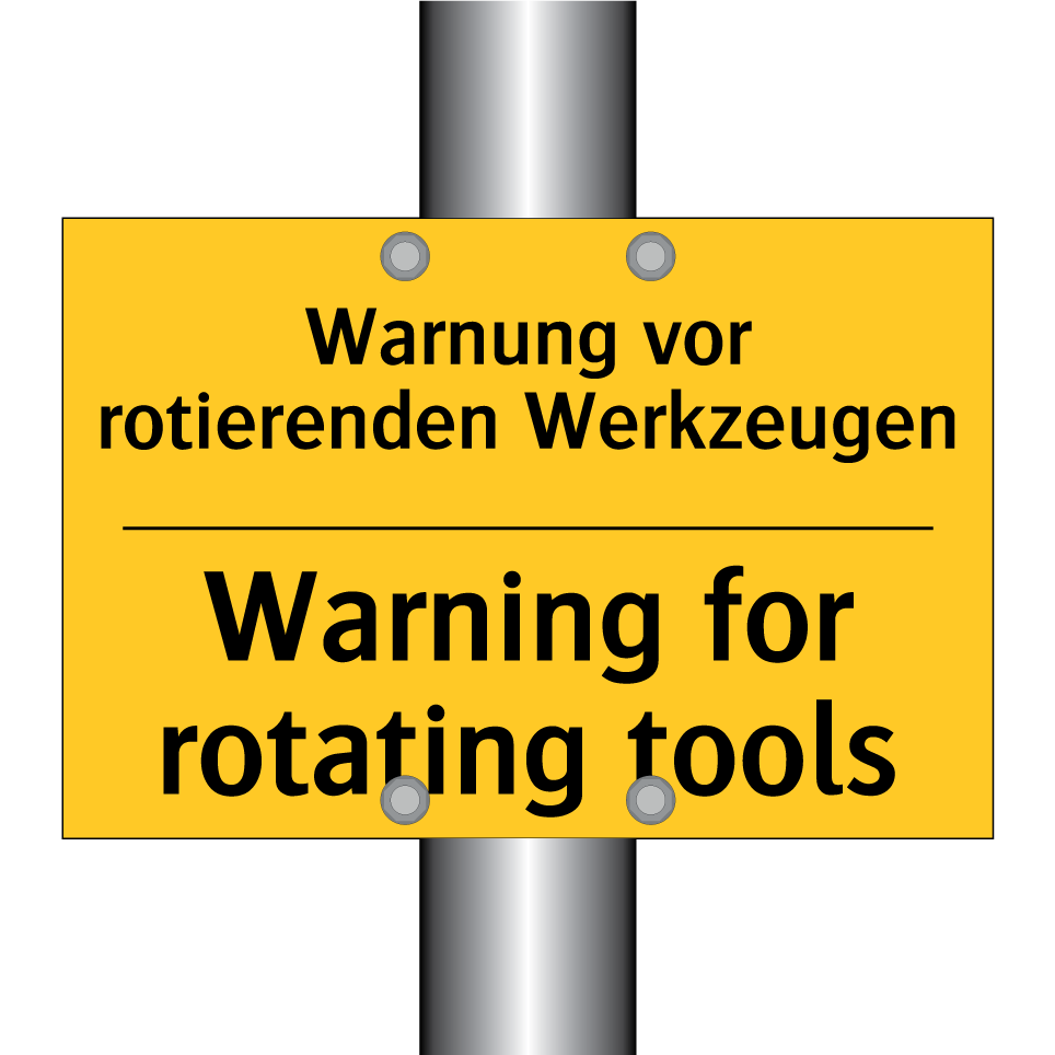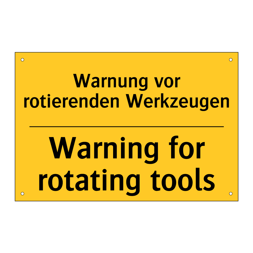 Zweisprachiges Warnschild mit deutschem Text Warnung vor rotierenden Werkzeugen und englischem Text Warning for rotating tools