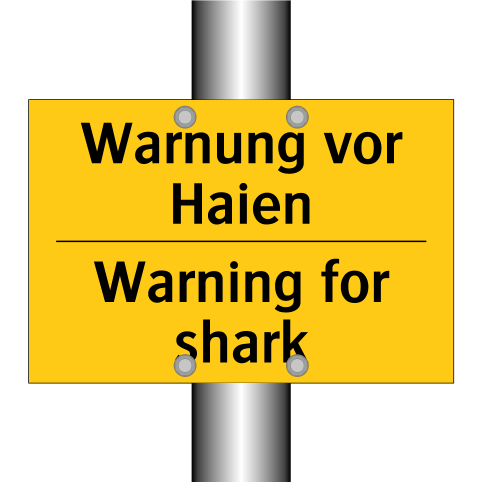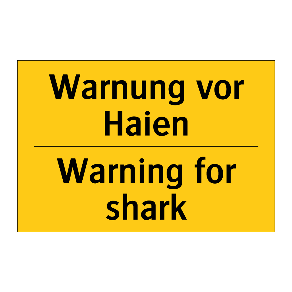 Zweisprachiges Warnschild mit deutschem Text Warnung vor Haien und englischem Text Warning for shark