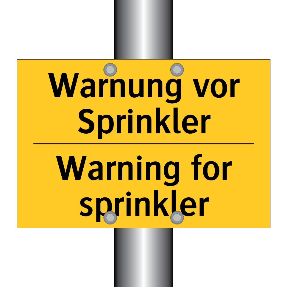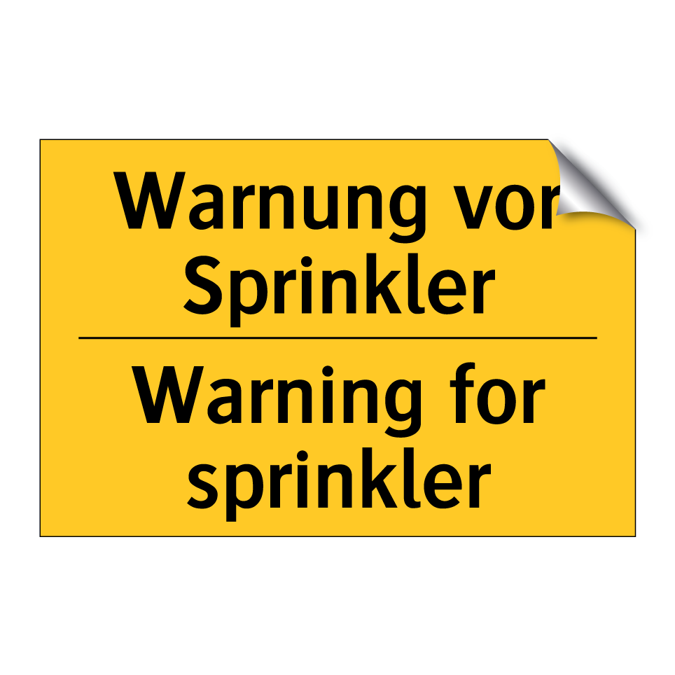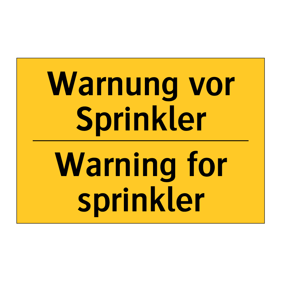 Zweisprachiges Warnschild mit deutschem Text Warnung vor Sprinkler und englischem Text Warning for sprinkler