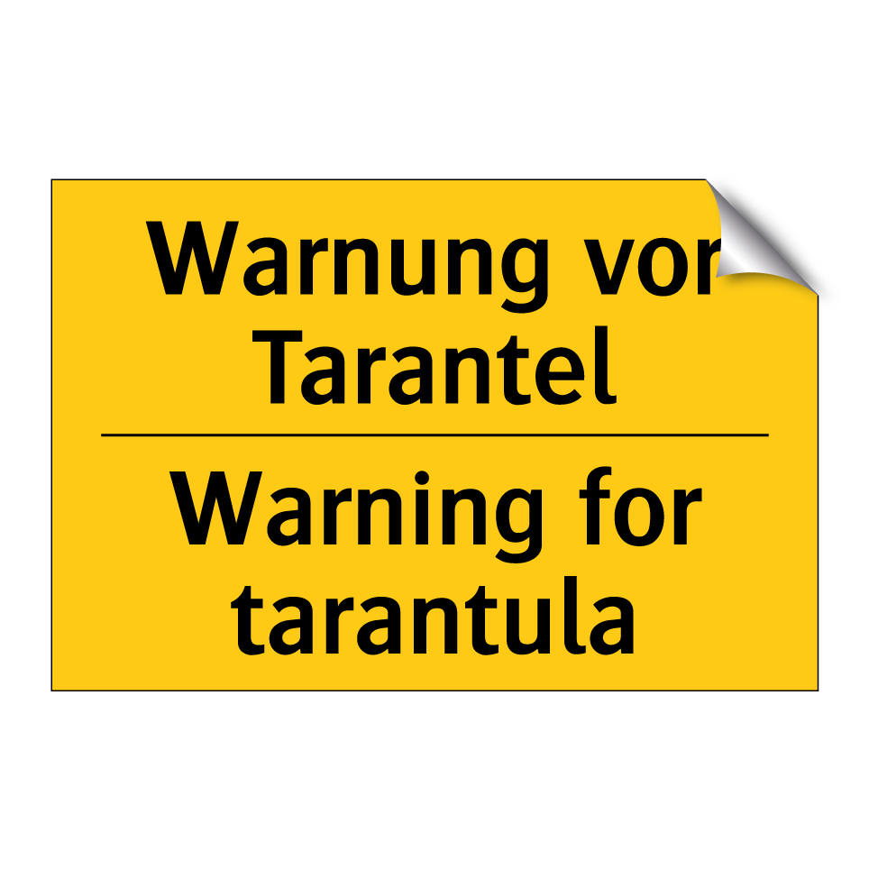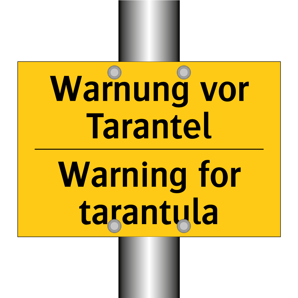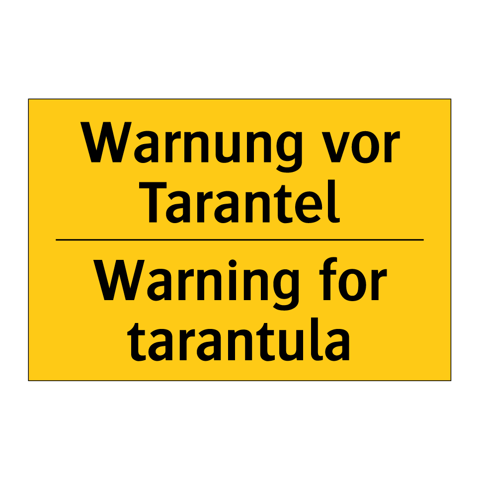 Zweisprachiges Warnschild mit deutschem Text Warnung vor Tarantel und englischem Text Warning for tarantula