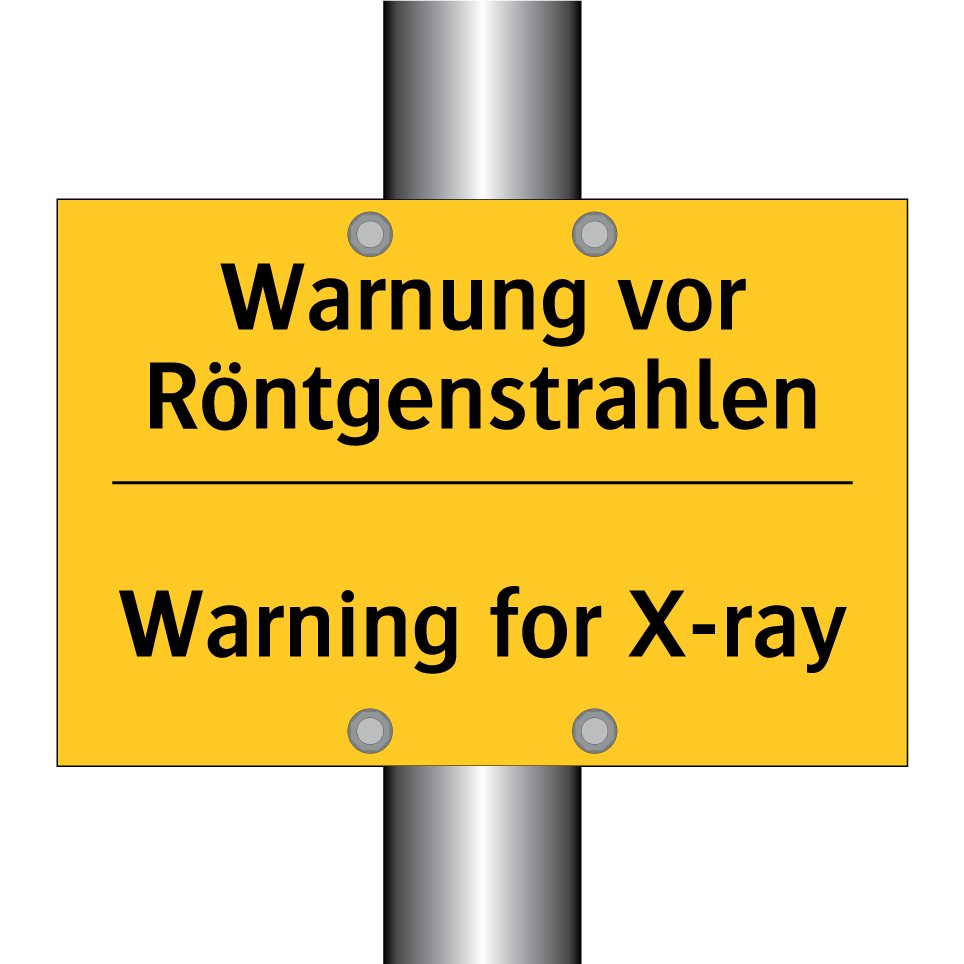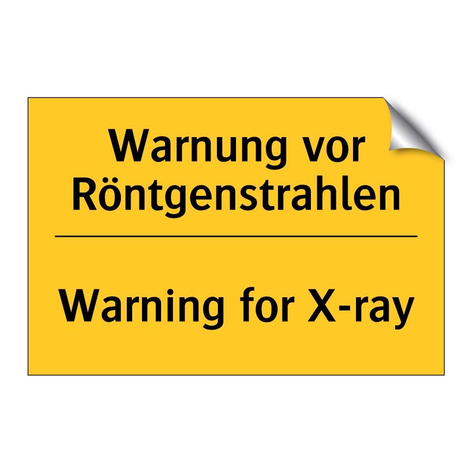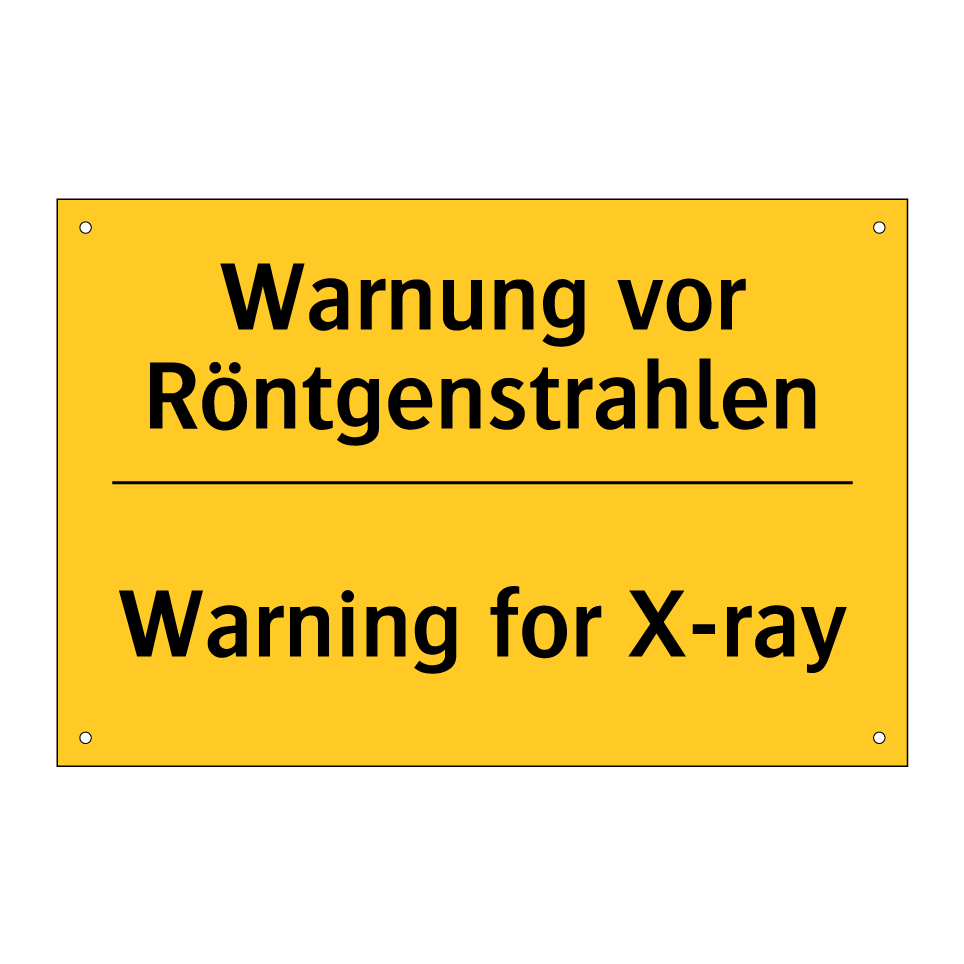 Zweisprachiges Warnschild mit deutschem Text Warnung vor Röntgenstrahlen und englischem Text Warning for X-ray