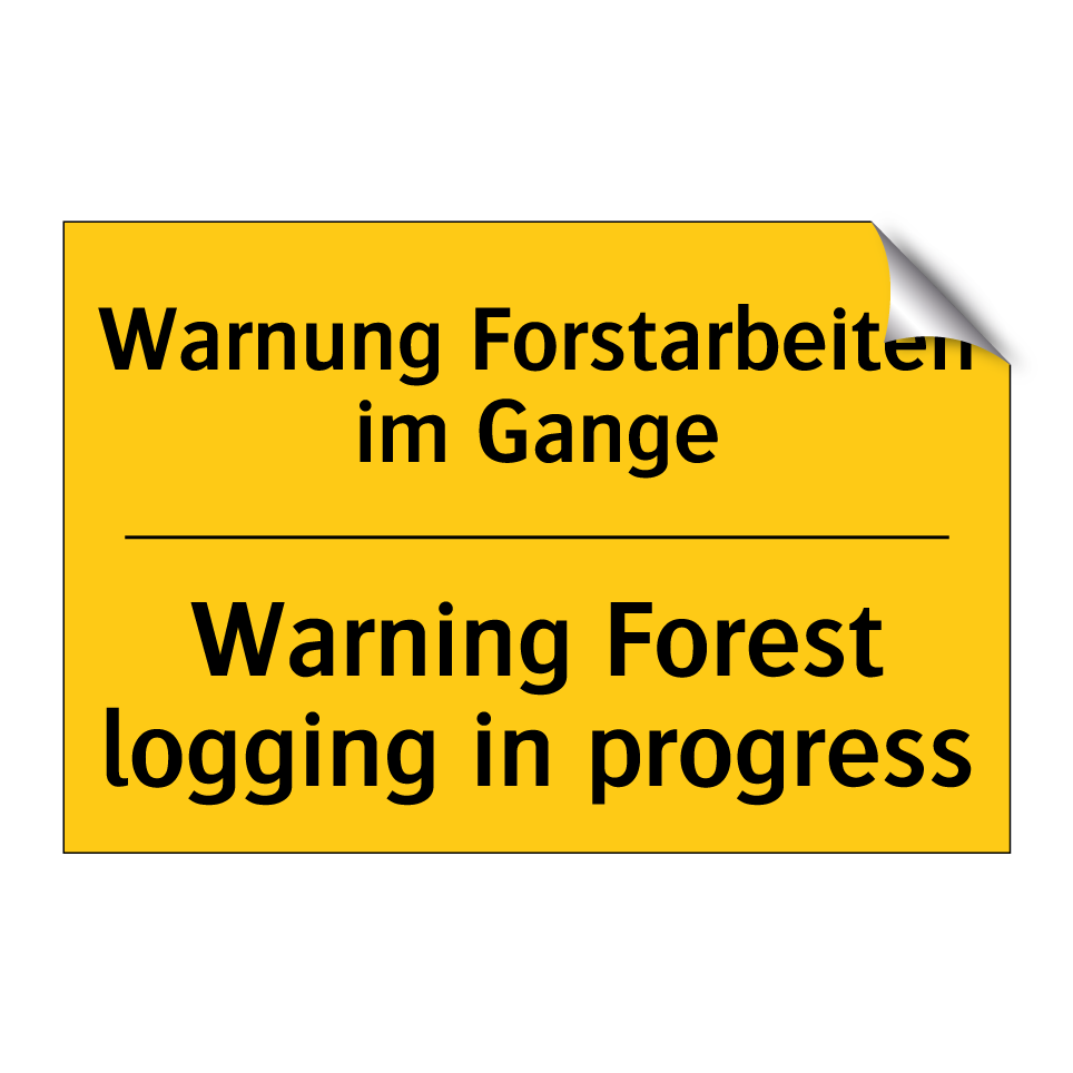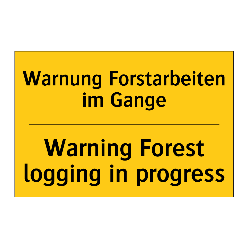Zweisprachiges Warnschild mit deutschem Text Warnung Forstarbeiten im Gange und englischem Text Warning Forest logging in progress