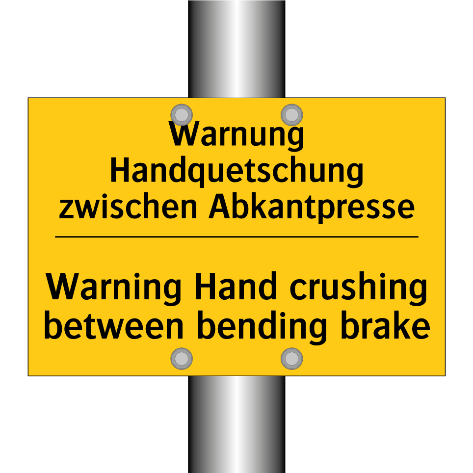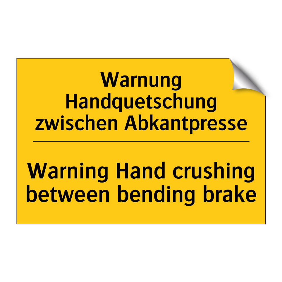 Zweisprachiges Warnschild mit deutschem Text Warnung Handquetschung zwischen Abkantpresse und englischem Text Warning Hand crushing between bending brake