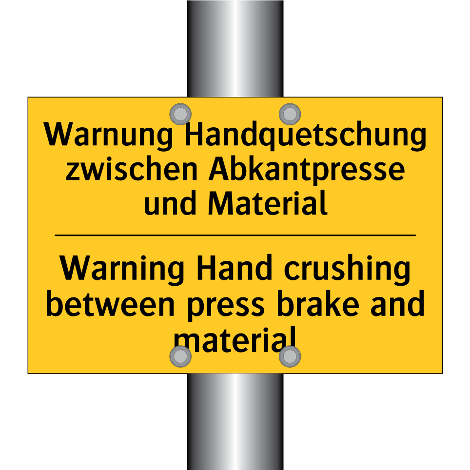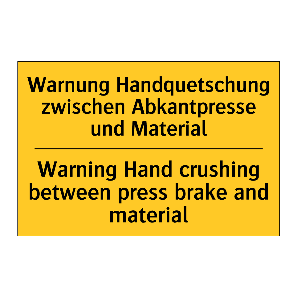 Zweisprachiges Warnschild mit deutschem Text Warnung Handquetschung zwischen Abkantpresse und Material und englischem Text Warning Hand crushing between press brake and material