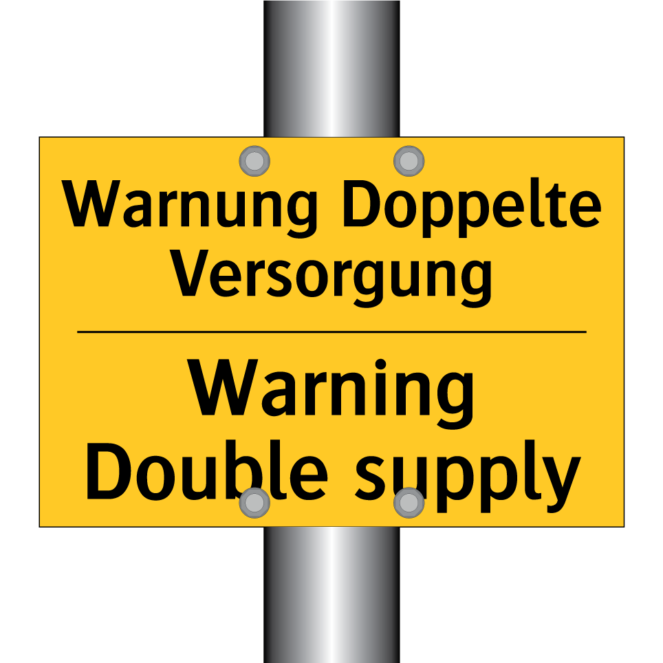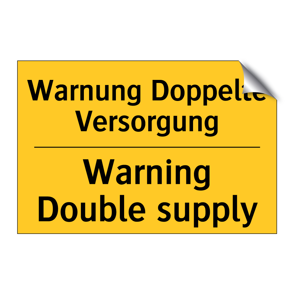 Zweisprachiges Warnschild mit deutschem Text Warnung Doppelte Versorgung und englischem Text Warning Double supply