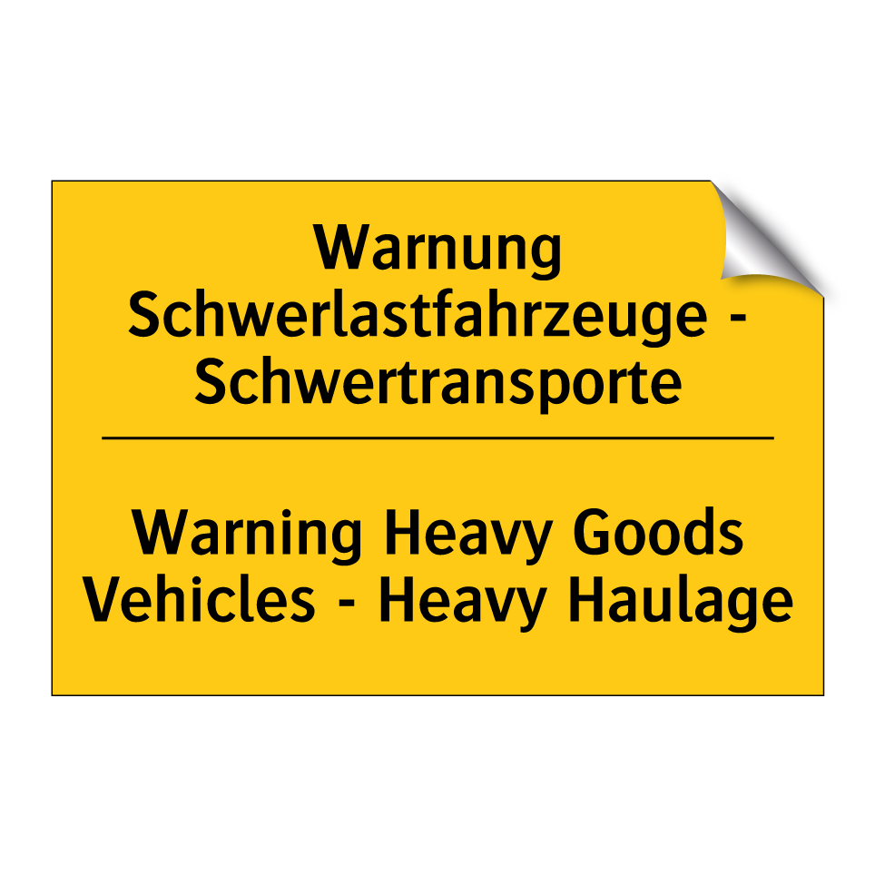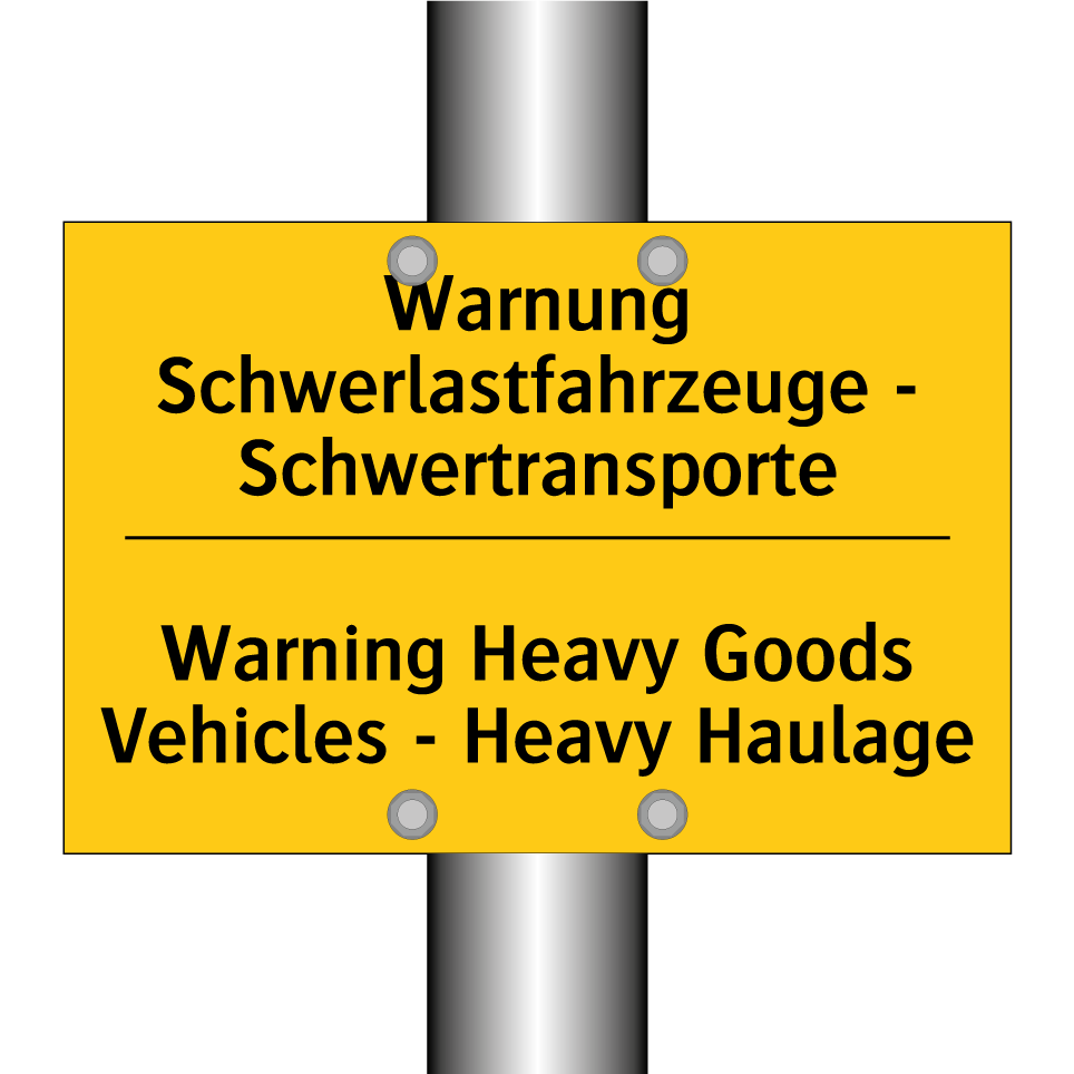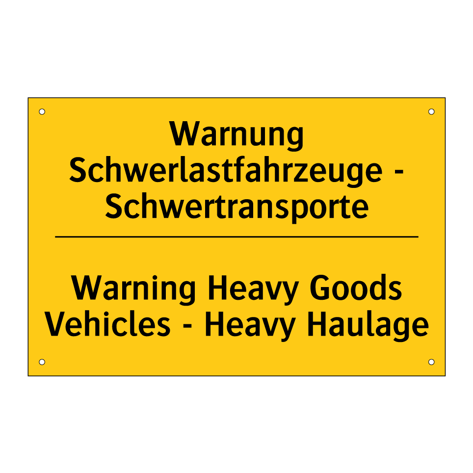 Zweisprachiges Warnschild mit deutschem Text Warnung Schwerlastfahrzeuge - Schwertransporte und englischem Text Warning Heavy Goods Vehicles - Heavy Haulage