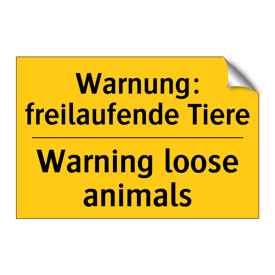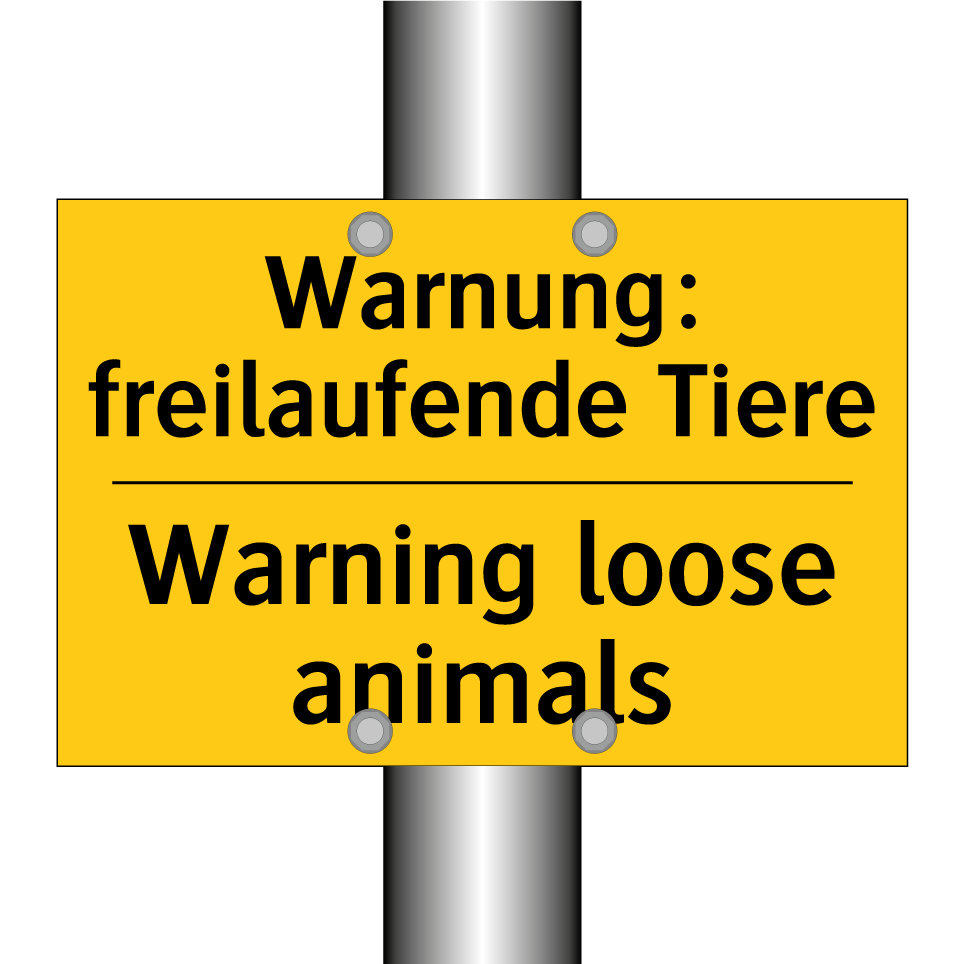 Zweisprachiges Warnschild mit deutschem Text Warnung: freilaufende Tiere und englischem Text Warning loose animals