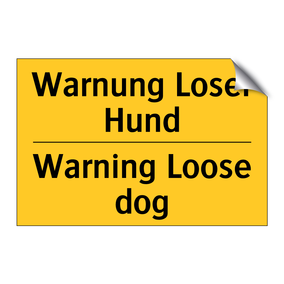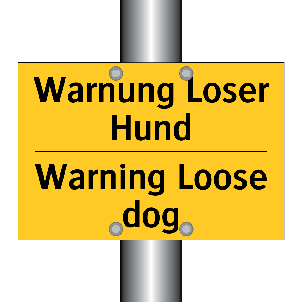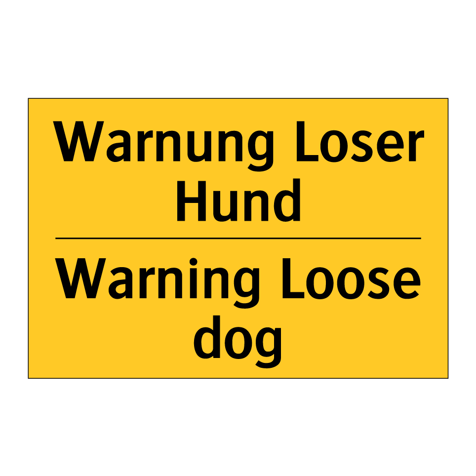 Zweisprachiges Warnschild mit deutschem Text Warnung Loser Hund und englischem Text Warning Loose dog