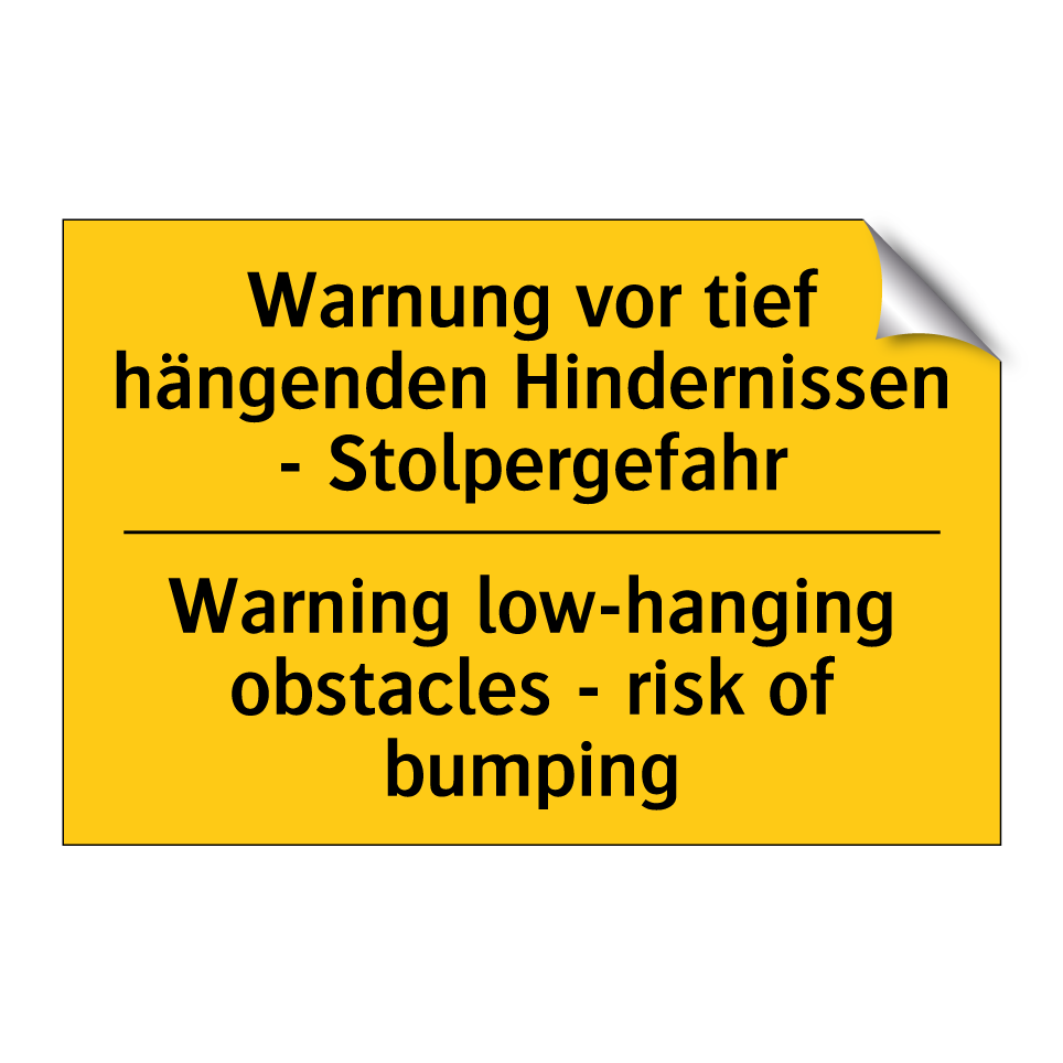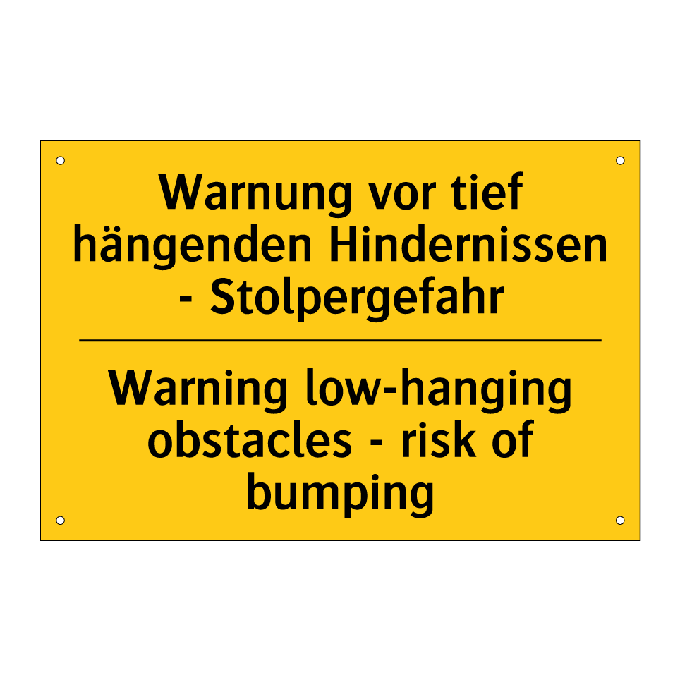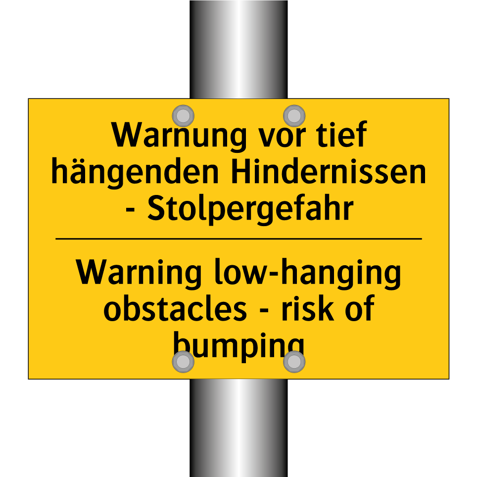 Zweisprachiges Warnschild mit deutschem Text Warnung vor tief hängenden Hindernissen - Stolpergefahr und englischem Text Warning low-hanging obstacles - risk of bumping