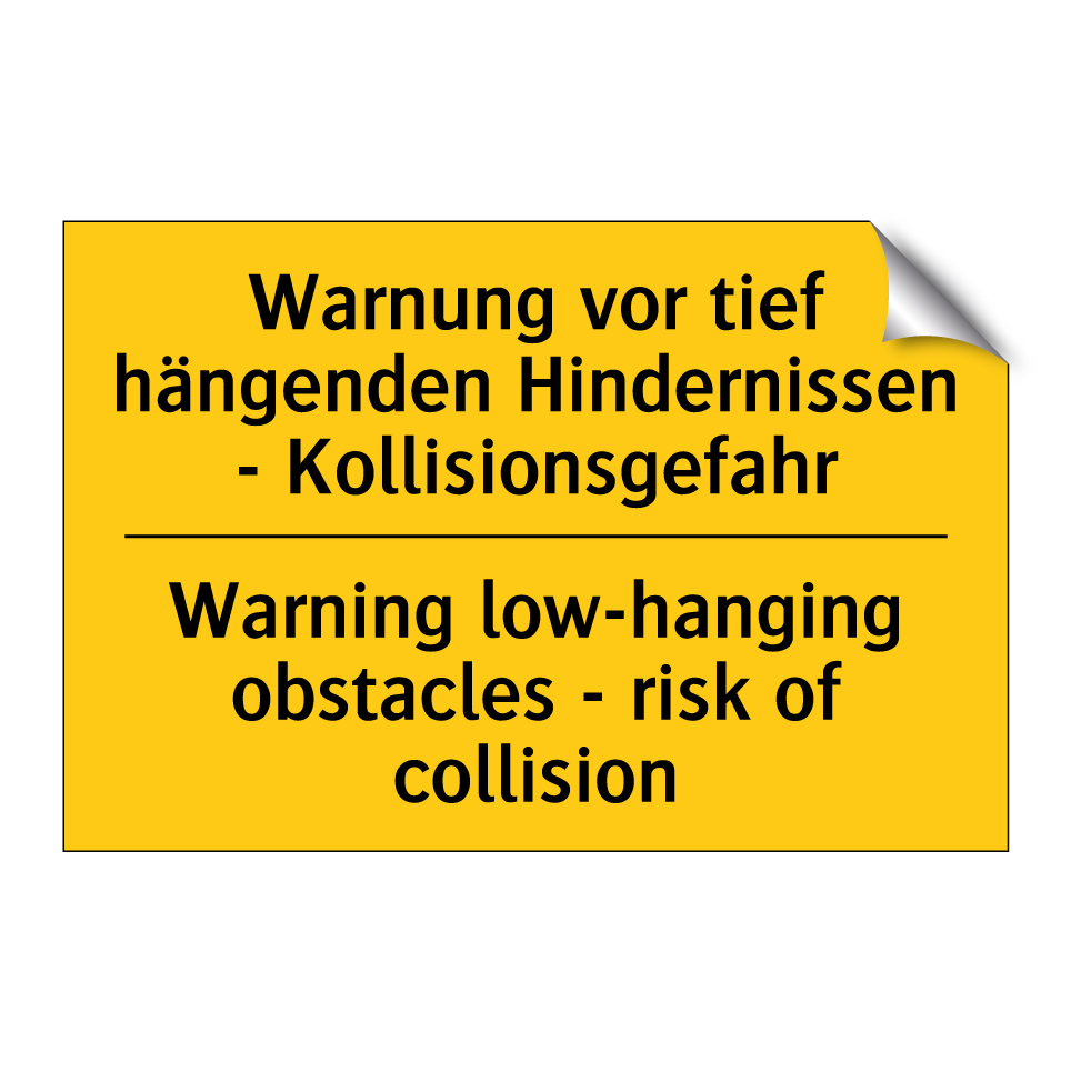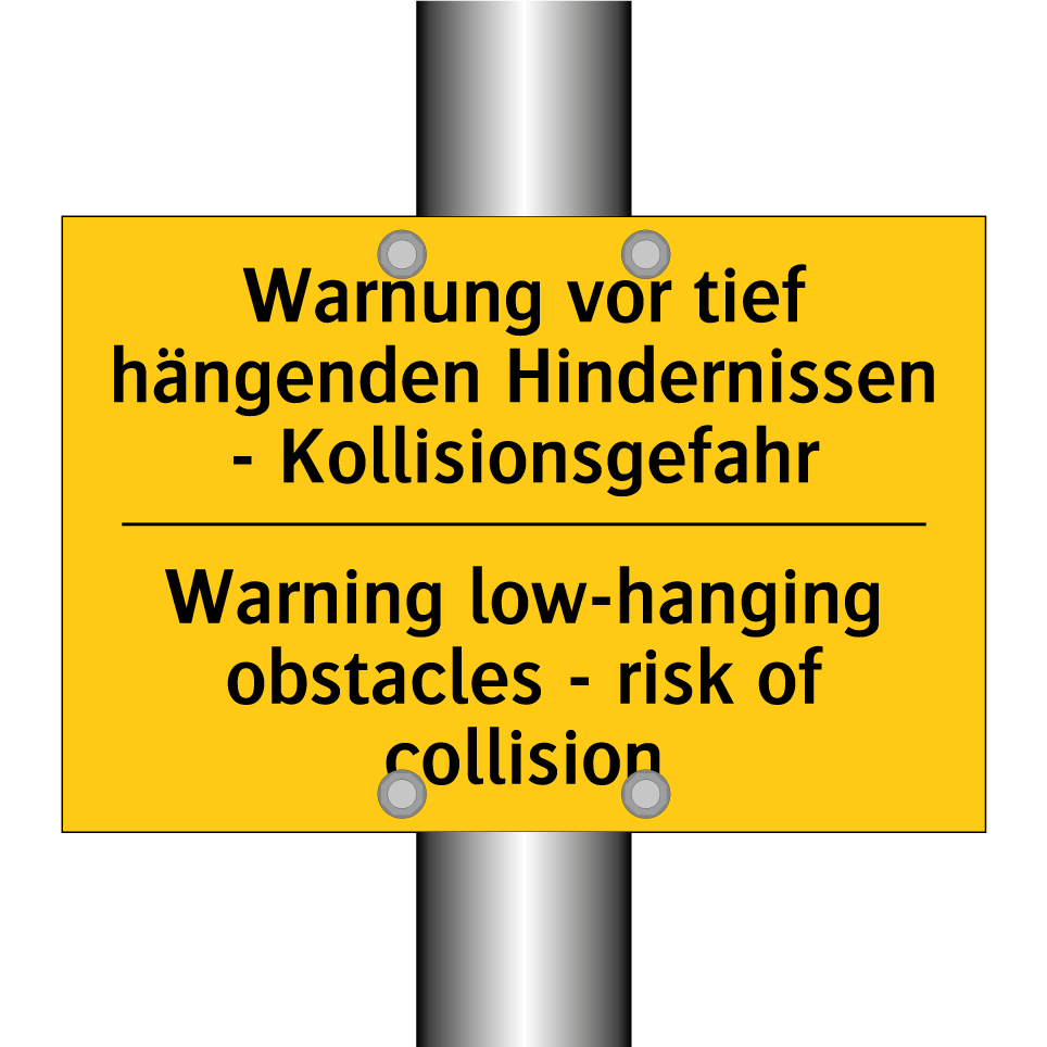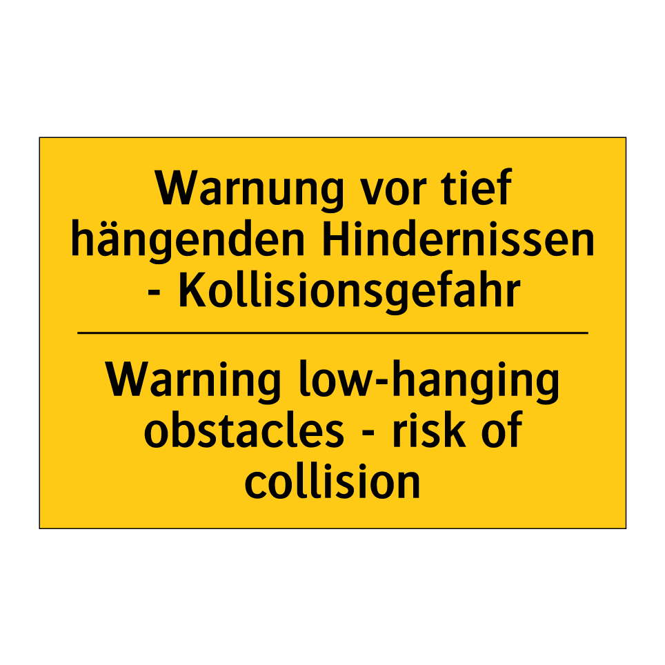 Zweisprachiges Warnschild mit deutschem Text Warnung vor tief hängenden Hindernissen - Kollisionsgefahr und englischem Text Warning low-hanging obstacles - risk of collision