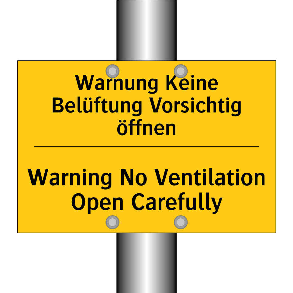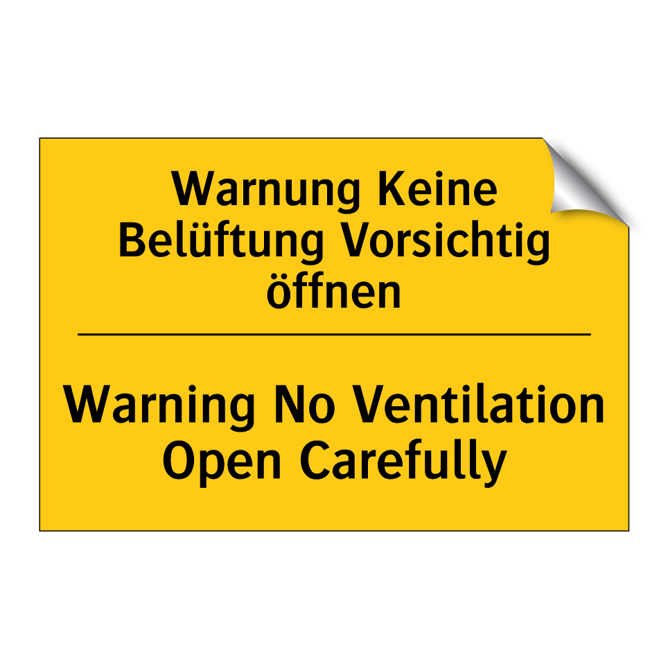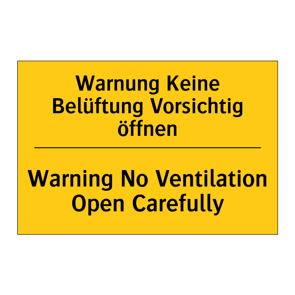 Zweisprachiges Warnschild mit deutschem Text Warnung Keine Belüftung Vorsichtig öffnen und englischem Text Warning No Ventilation Open Carefully