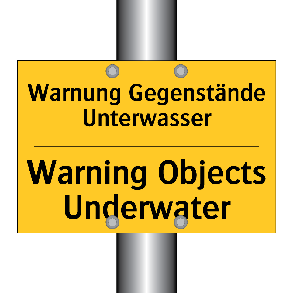 Zweisprachiges Warnschild mit deutschem Text Warnung Gegenstände Unterwasser und englischem Text Warning Objects Underwater
