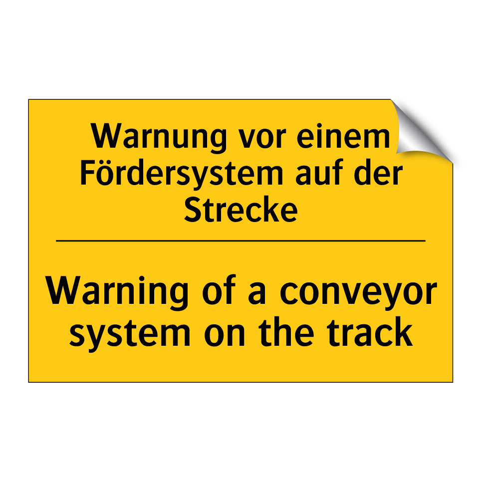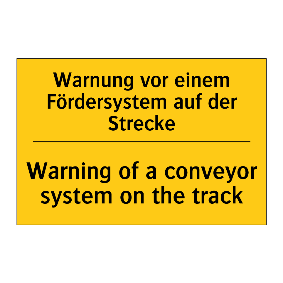 Zweisprachiges Warnschild mit deutschem Text Warnung vor einem Fördersystem auf der Strecke und englischem Text Warning of a conveyor system on the track