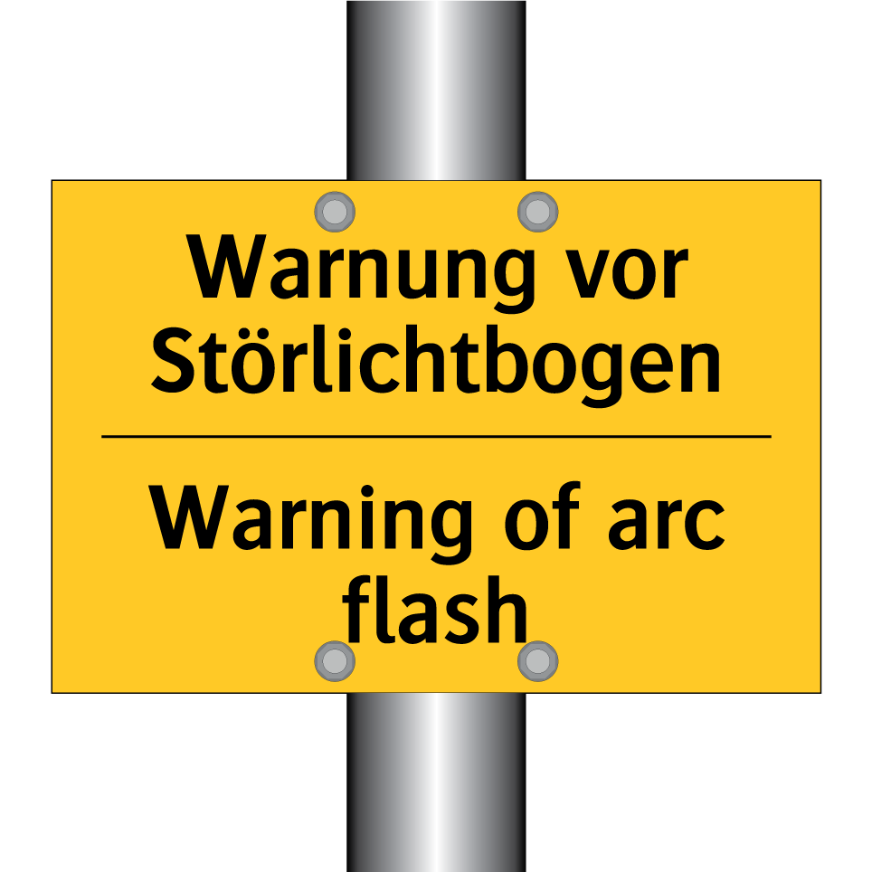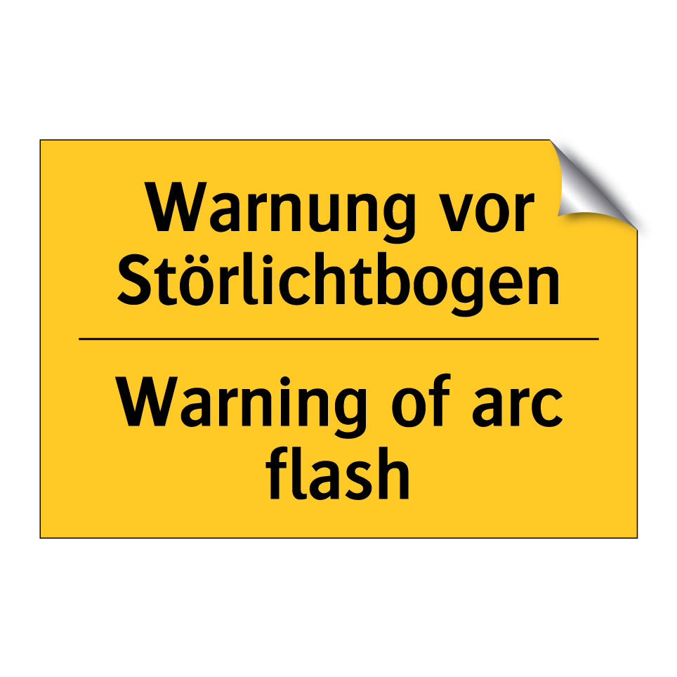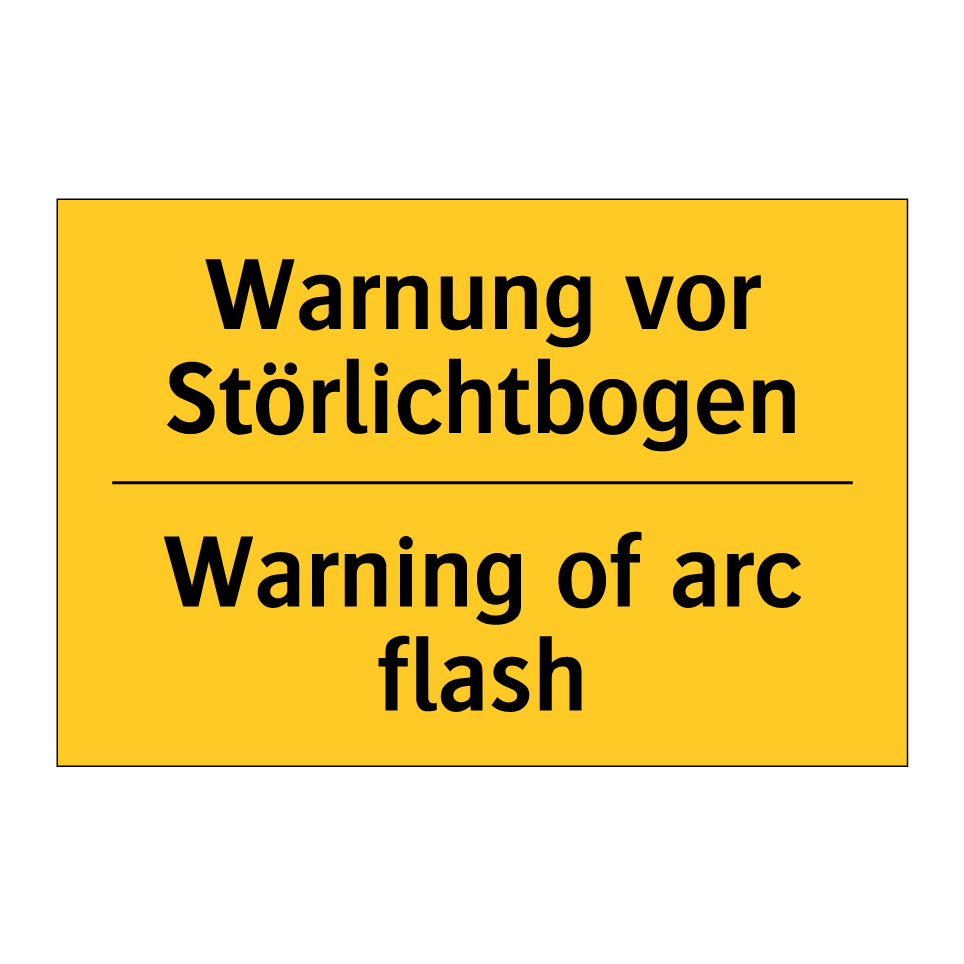 Zweisprachiges Warnschild mit deutschem Text Warnung vor Störlichtbogen und englischem Text Warning of arc flash