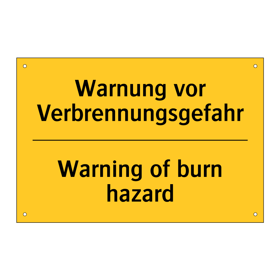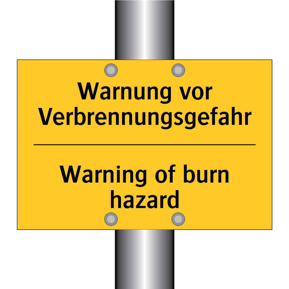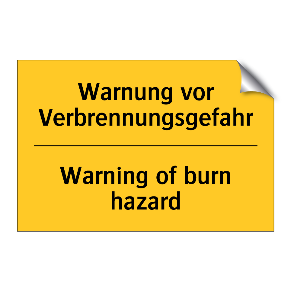 Zweisprachiges Warnschild mit deutschem Text Warnung vor Verbrennungsgefahr und englischem Text Warning of burn hazard