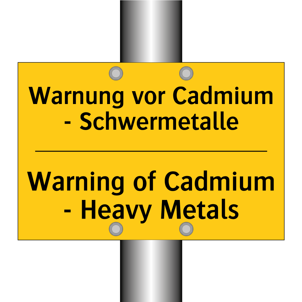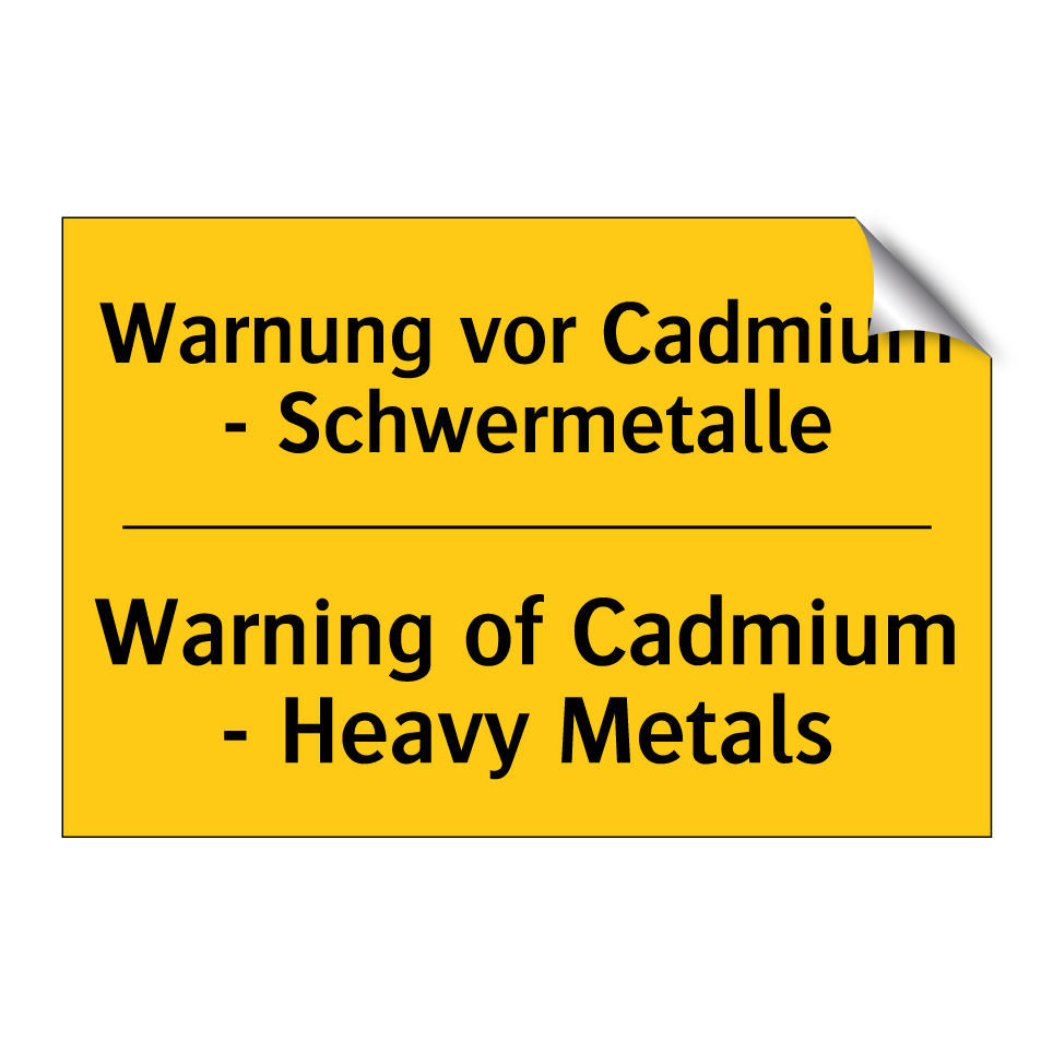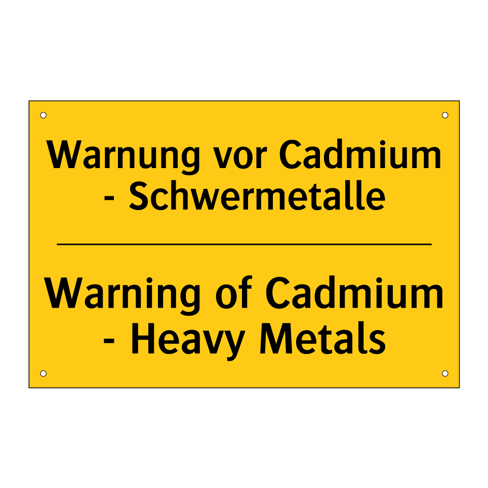 Zweisprachiges Warnschild mit deutschem Text Warnung vor Cadmium - Schwermetalle und englischem Text Warning of Cadmium - Heavy Metals