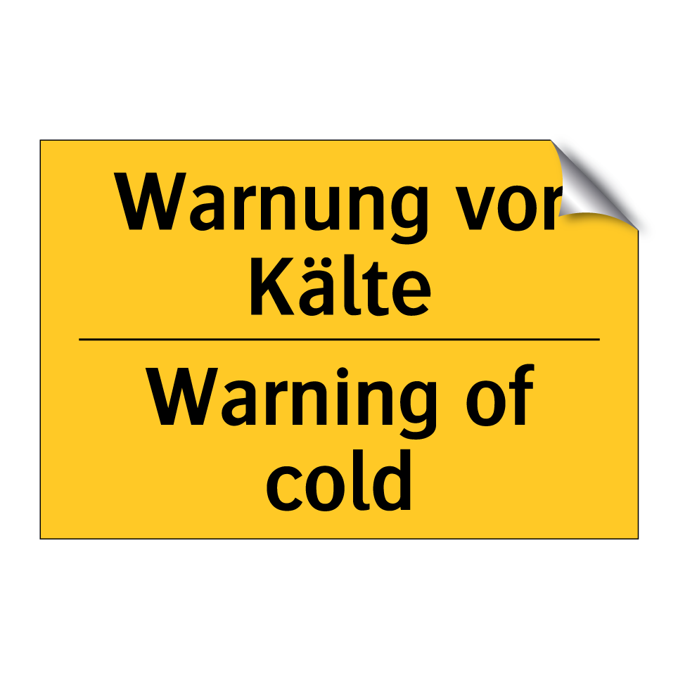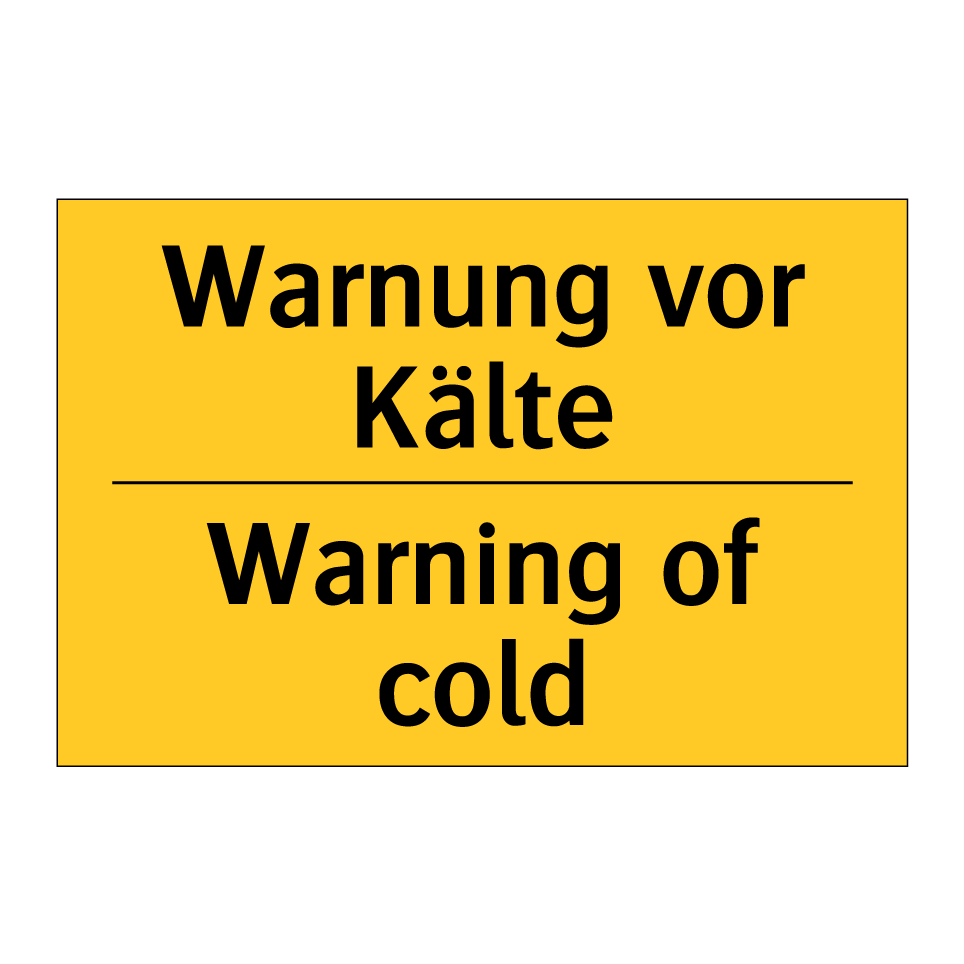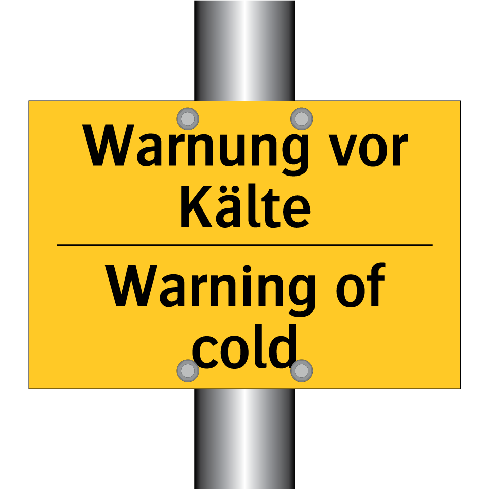Zweisprachiges Warnschild mit deutschem Text Warnung vor Kälte und englischem Text Warning of cold