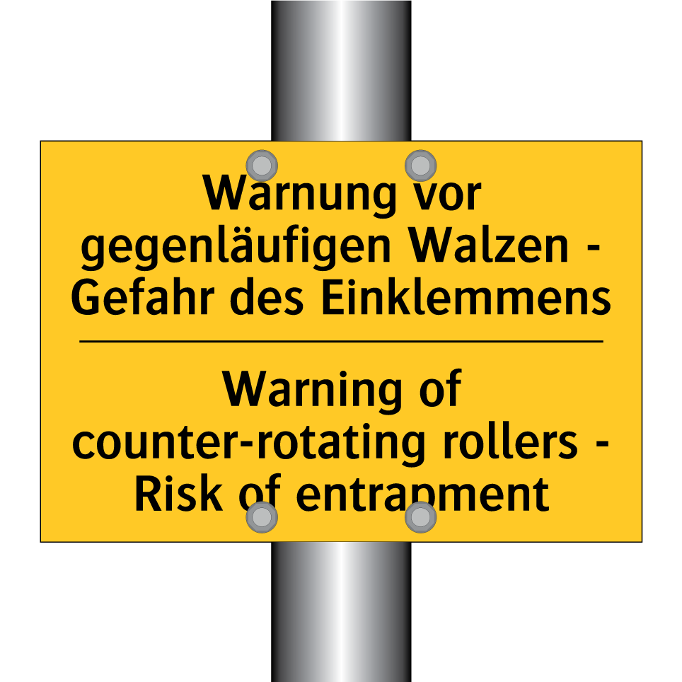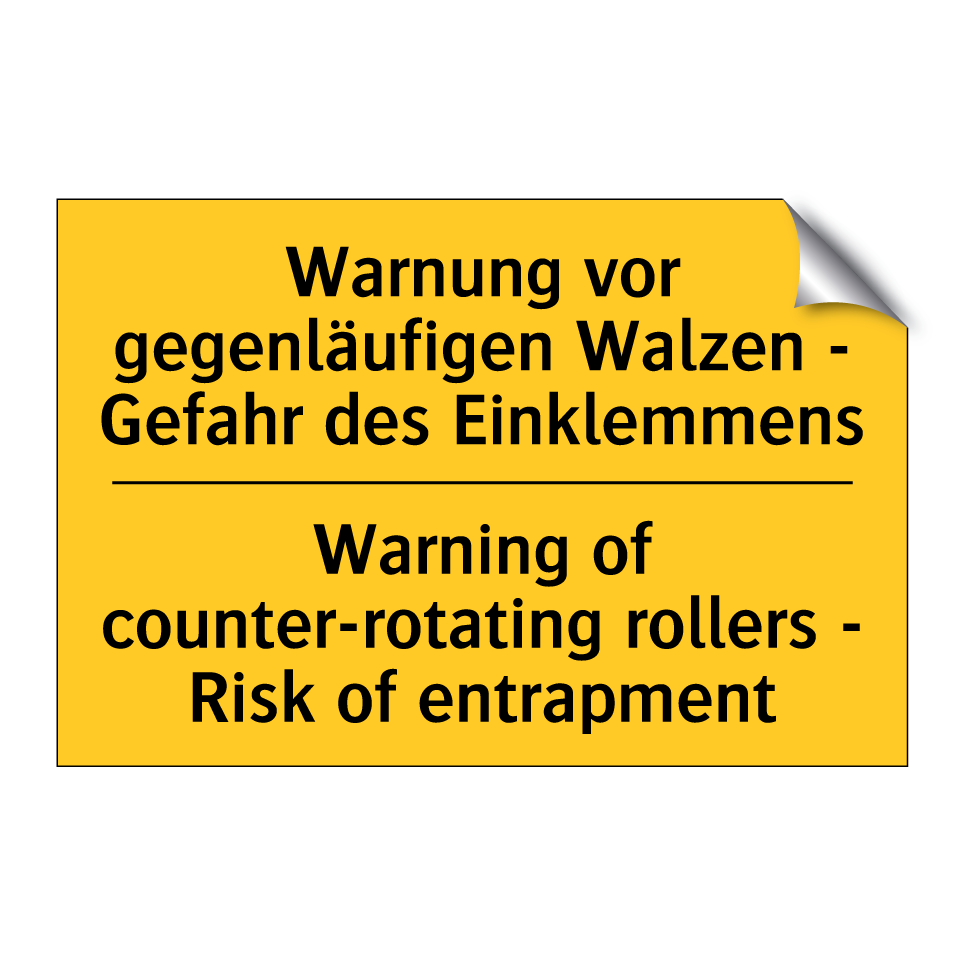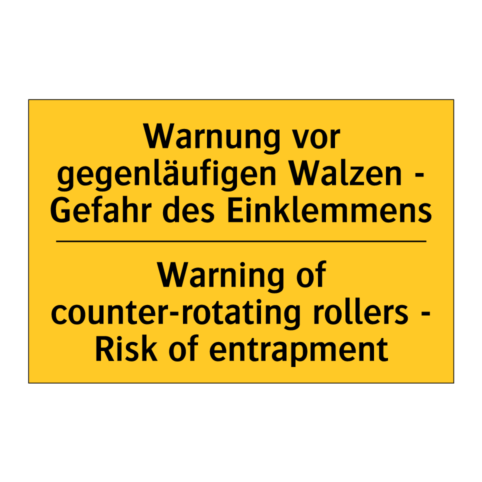 Zweisprachiges Warnschild mit deutschem Text Warnung vor gegenläufigen Walzen - Gefahr des Einklemmens und englischem Text Warning of counter-rotating rollers - Risk of entrapment