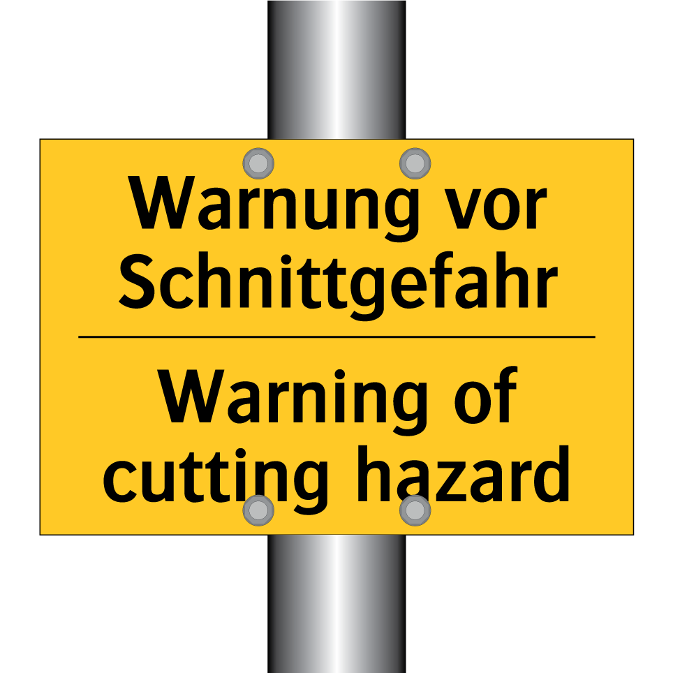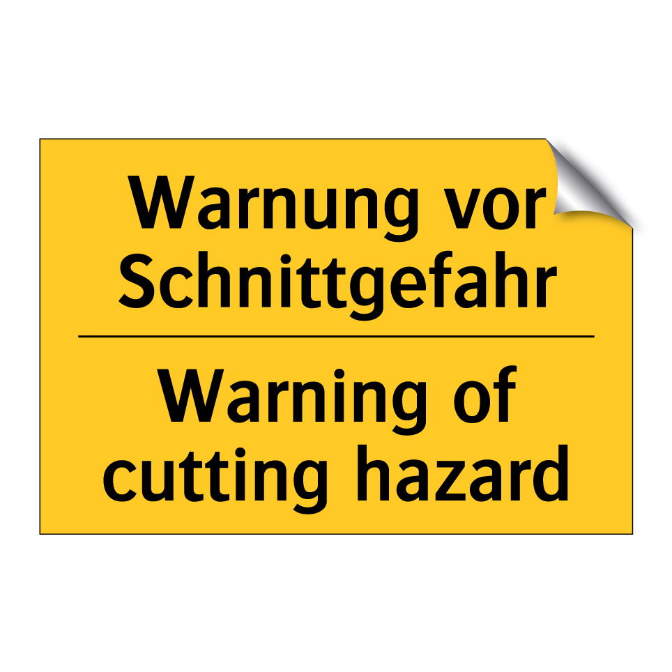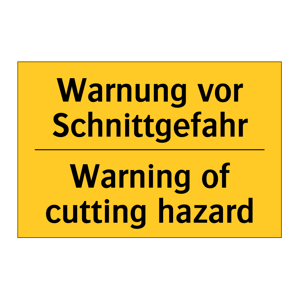Zweisprachiges Warnschild mit deutschem Text Warnung vor Schnittgefahr und englischem Text Warning of cutting hazard