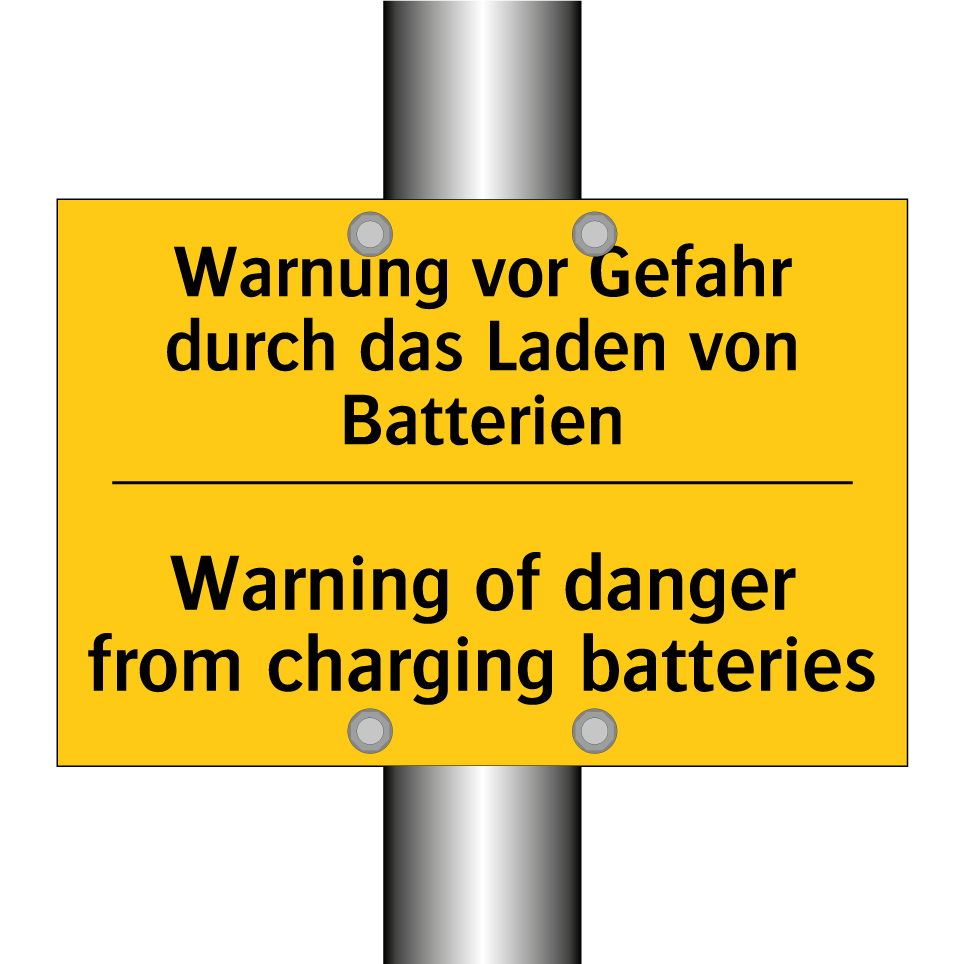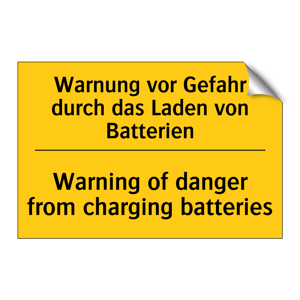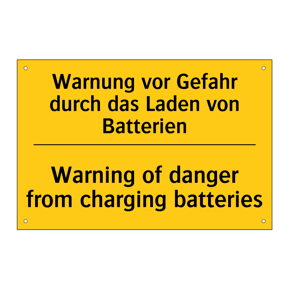 Zweisprachiges Warnschild mit deutschem Text Warnung vor Gefahr durch das Laden von Batterien und englischem Text Warning of danger from charging batteries