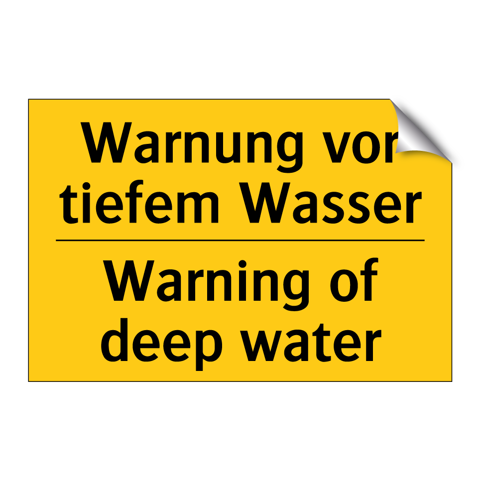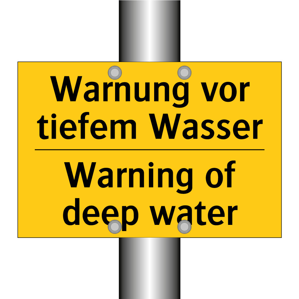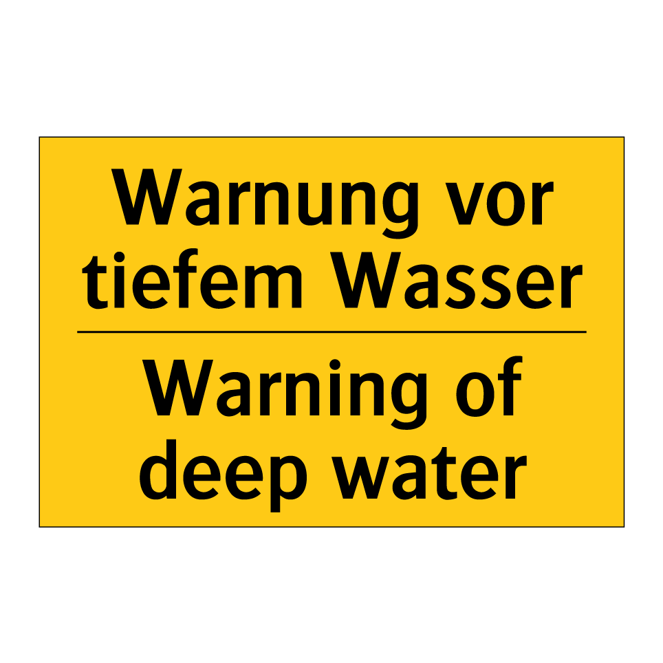 Zweisprachiges Warnschild mit deutschem Text Warnung vor tiefem Wasser und englischem Text Warning of deep water