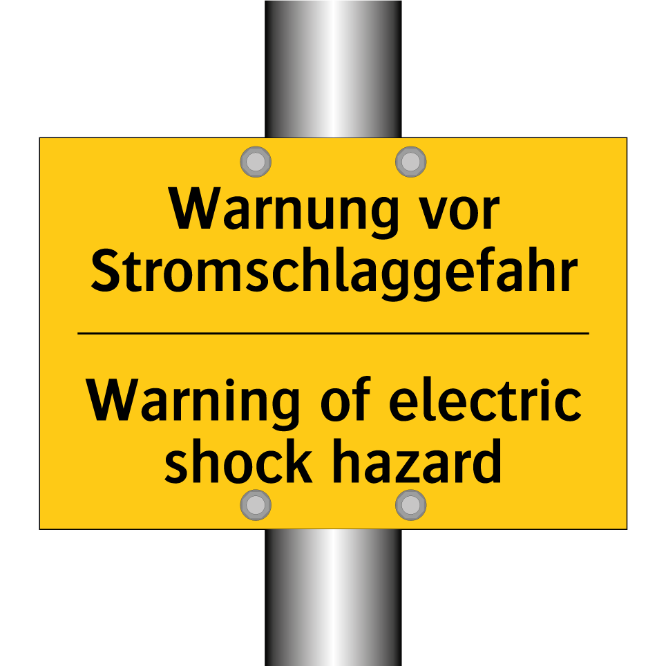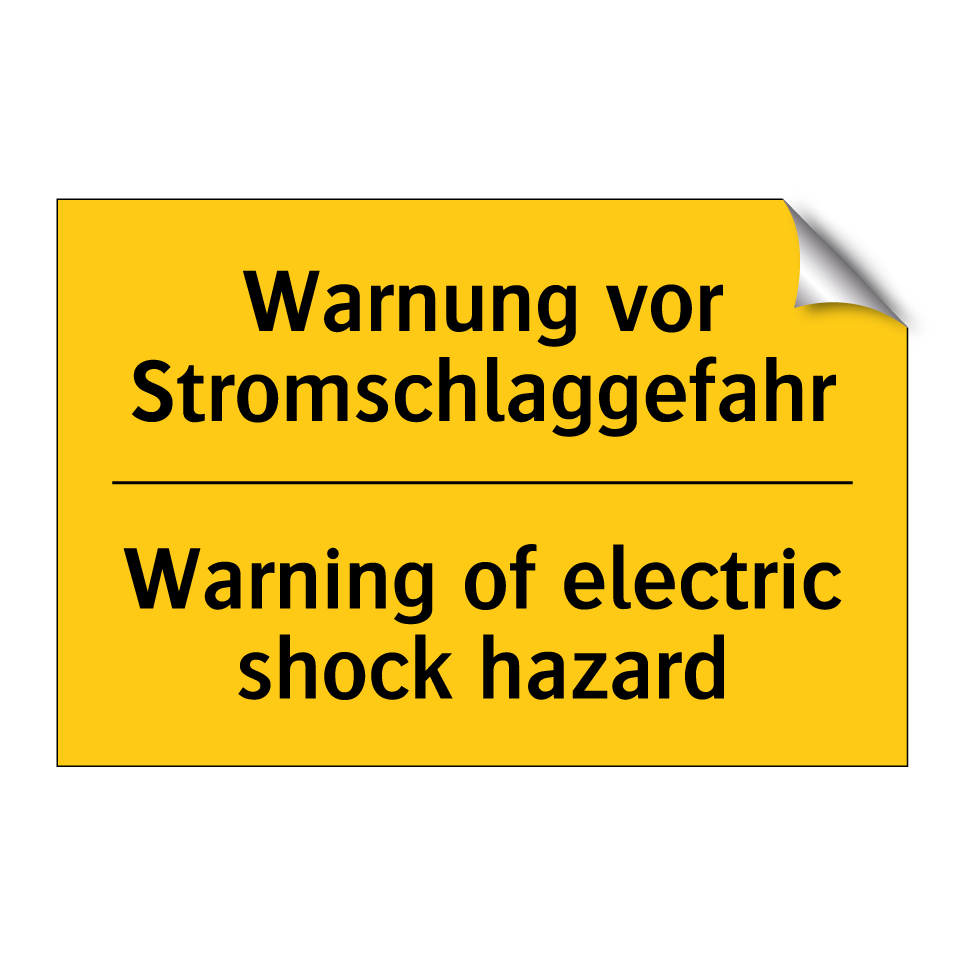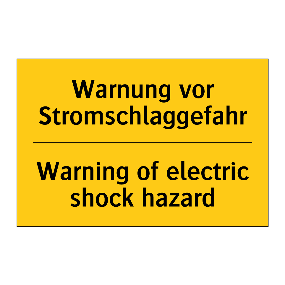 Zweisprachiges Warnschild mit deutschem Text Warnung vor Stromschlaggefahr und englischem Text Warning of electric shock hazard