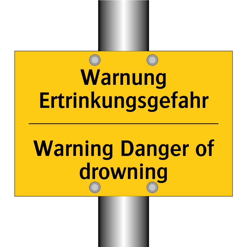 Zweisprachiges Warnschild mit deutschem Text Warnung Ertrinkungsgefahr und englischem Text Warning Danger of drowning