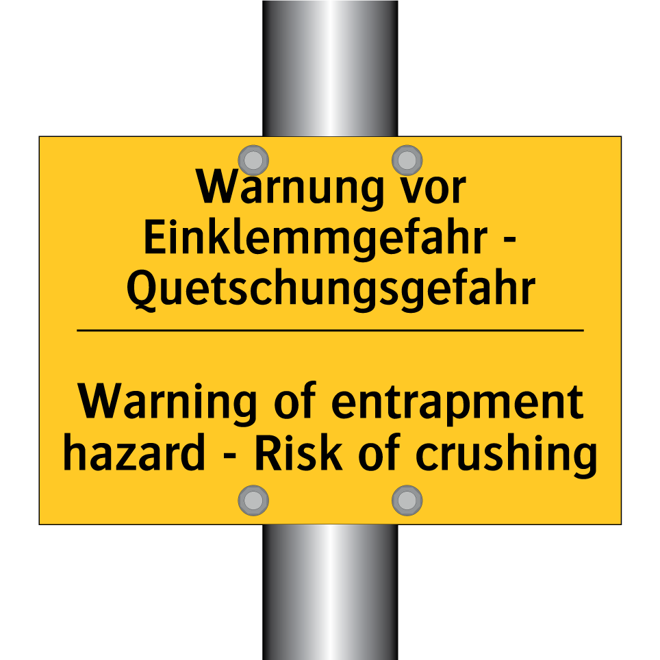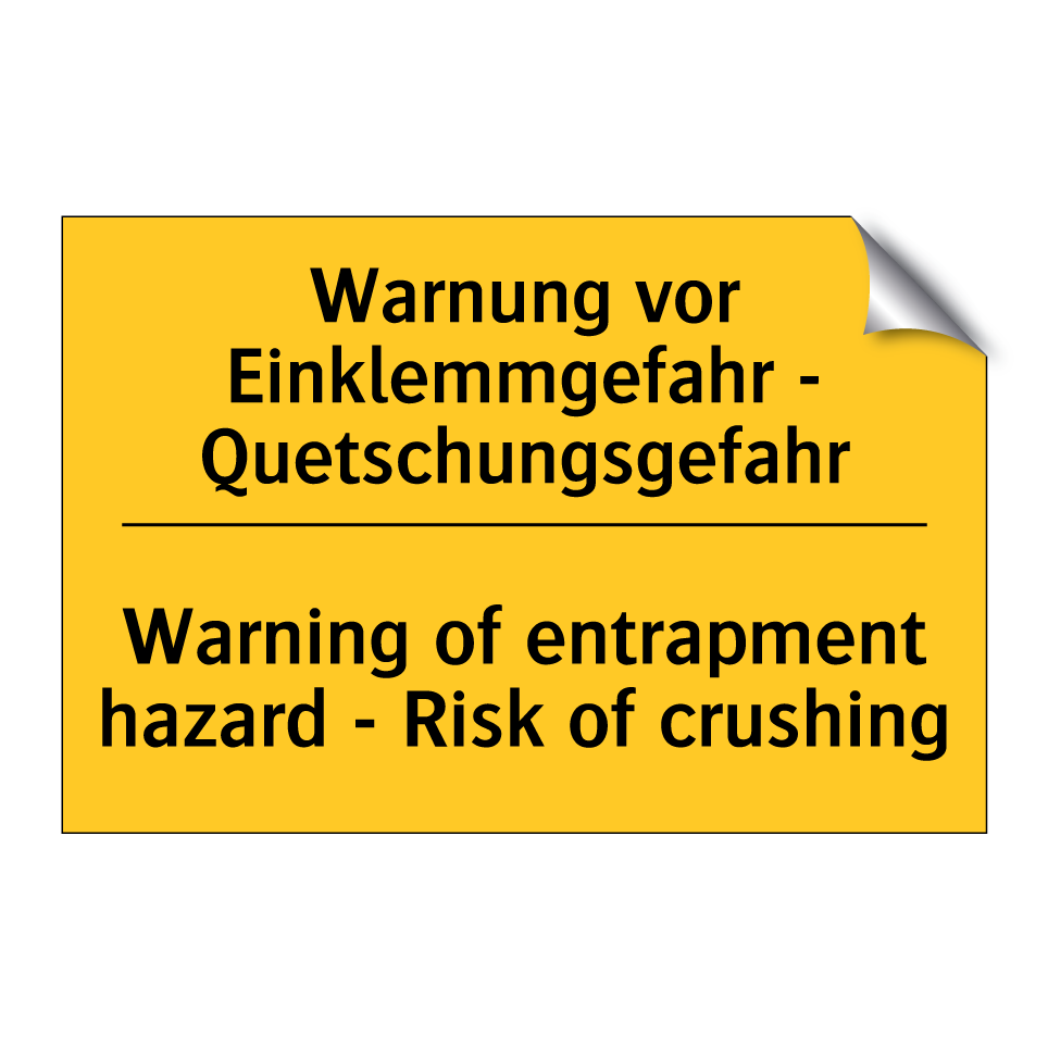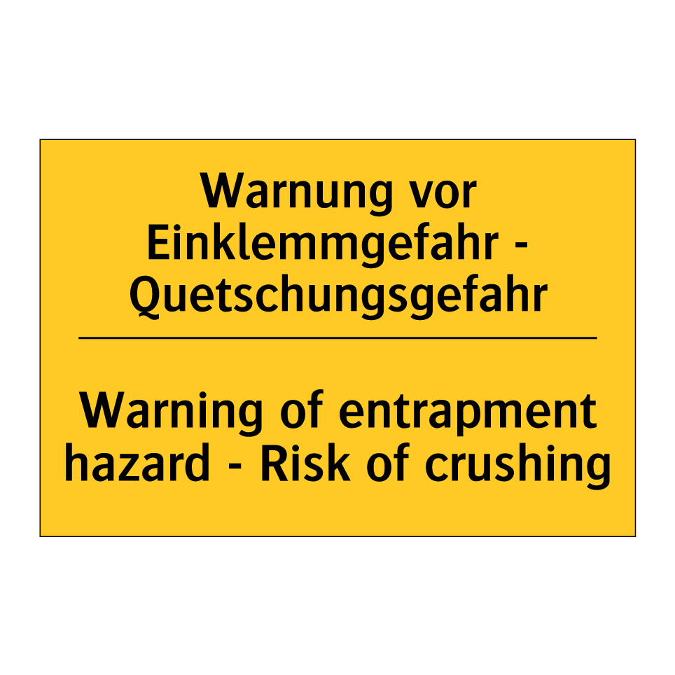 Zweisprachiges Warnschild mit deutschem Text Warnung vor Einklemmgefahr - Quetschungsgefahr und englischem Text Warning of entrapment hazard - Risk of crushing