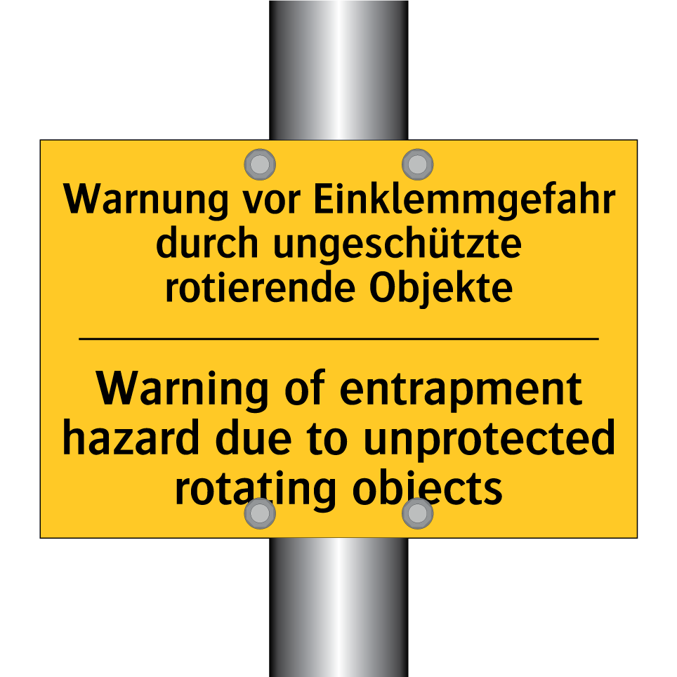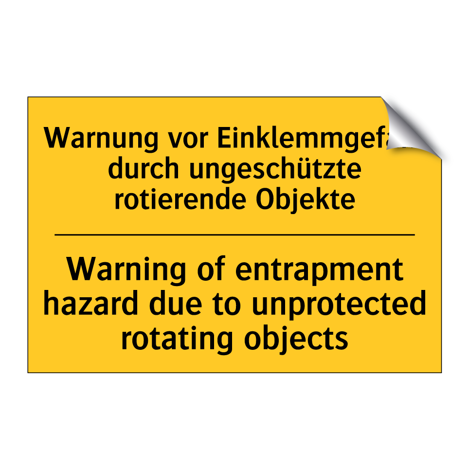 Zweisprachiges Warnschild mit deutschem Text Warnung vor Einklemmgefahr durch ungeschützte rotierende Objekte und englischem Text Warning of entrapment hazard due to unprotected rotating objects