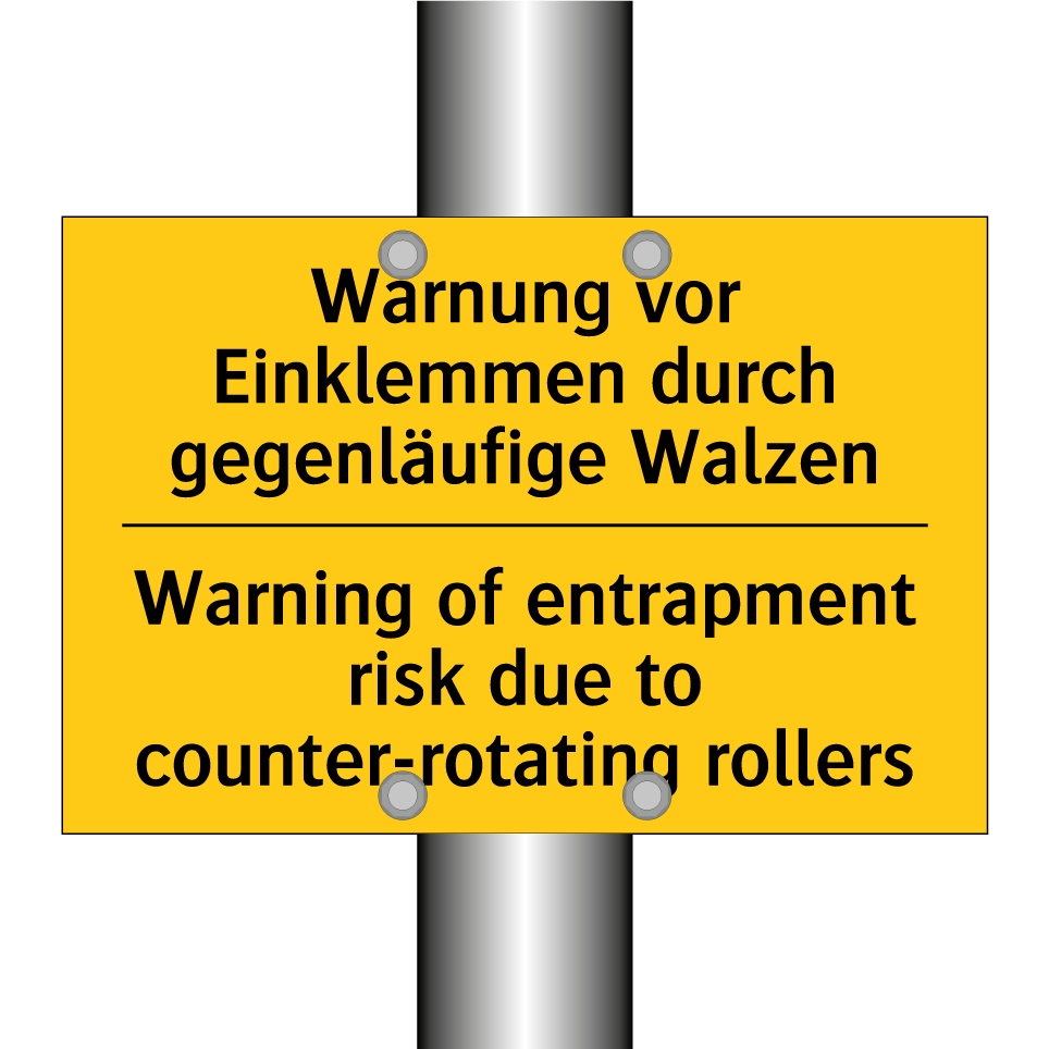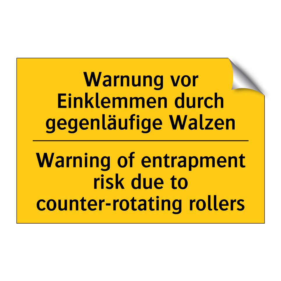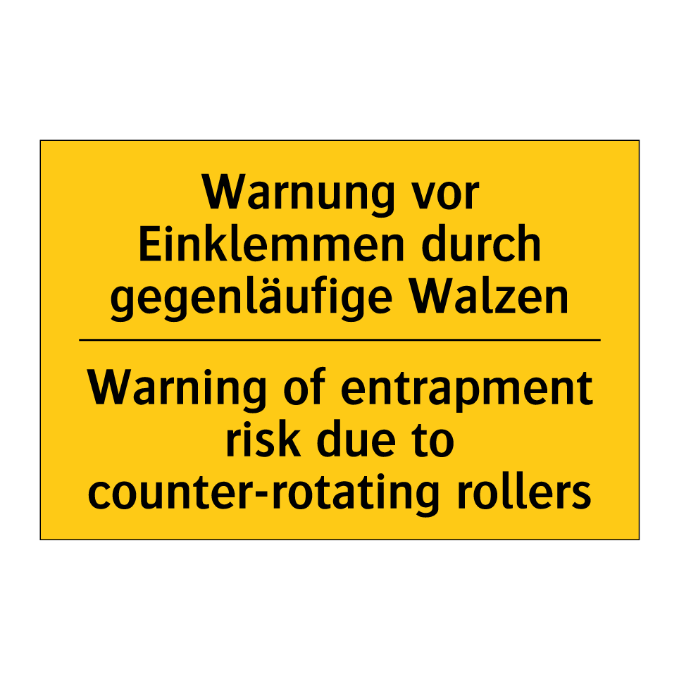 Zweisprachiges Warnschild mit deutschem Text Warnung vor Einklemmen durch gegenläufige Walzen und englischem Text Warning of entrapment risk due to counter-rotating rollers