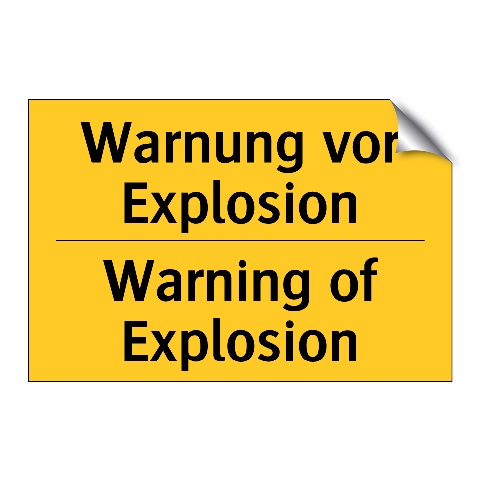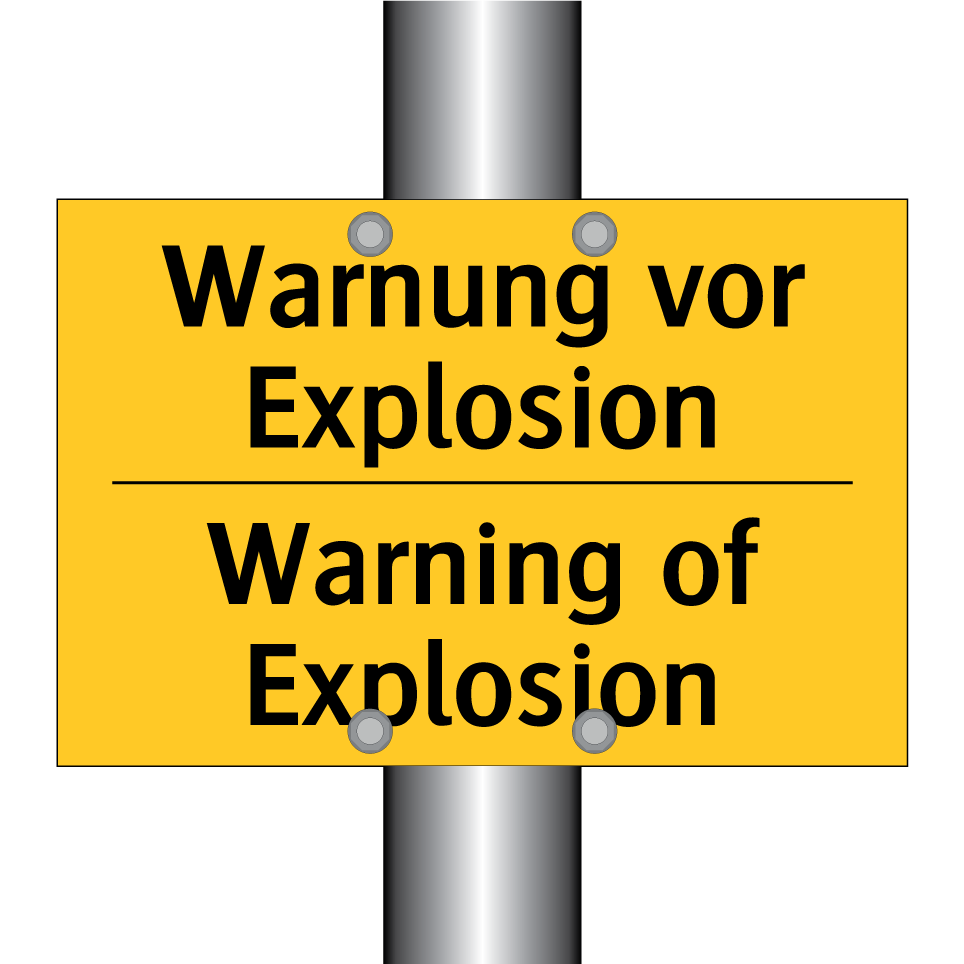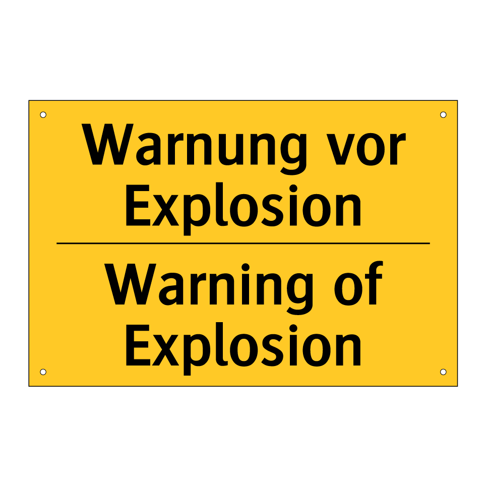 Zweisprachiges Warnschild mit deutschem Text Warnung vor Explosion und englischem Text Warning of Explosion