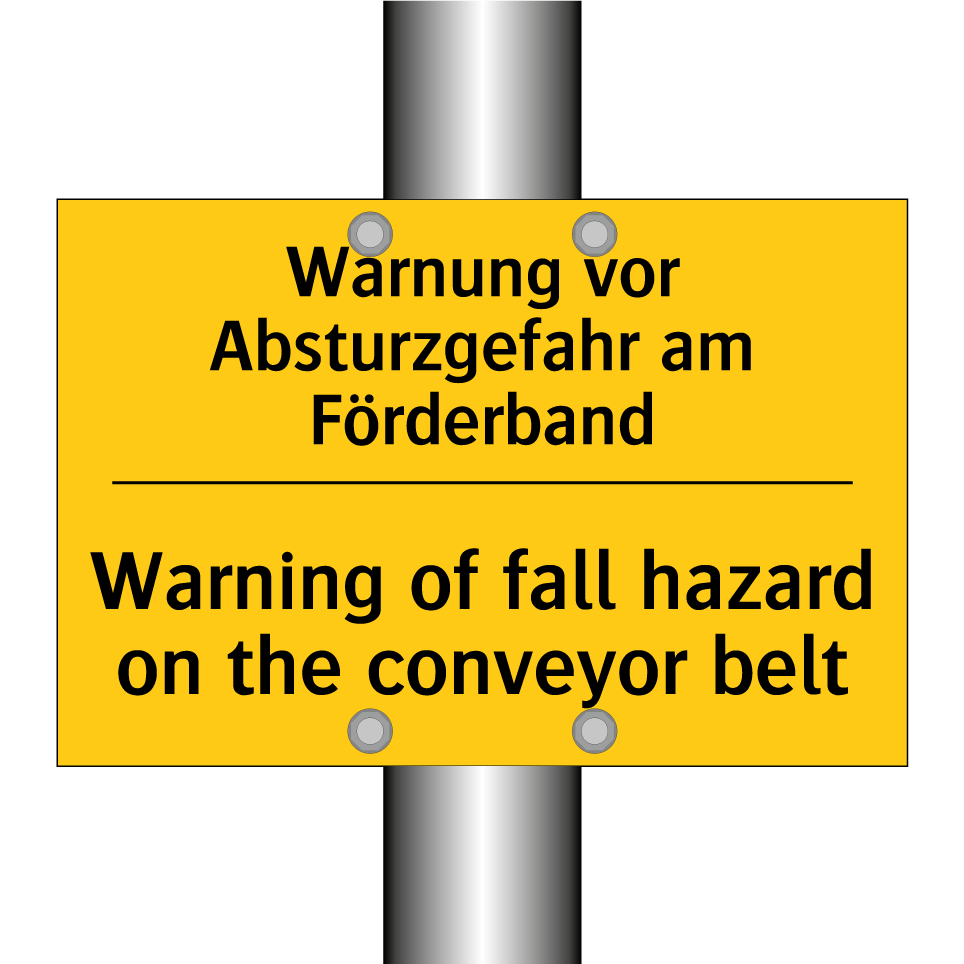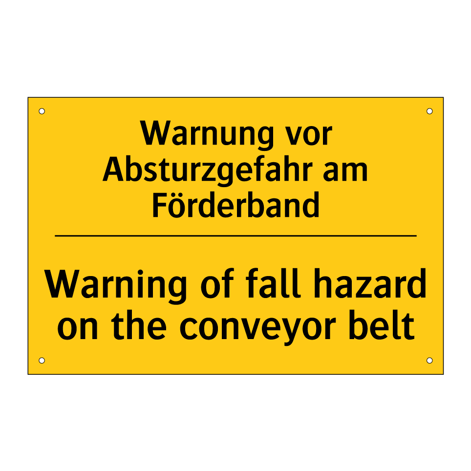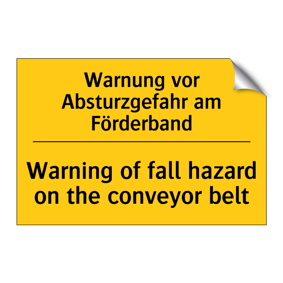 Zweisprachiges Warnschild mit deutschem Text Warnung vor Absturzgefahr am Förderband und englischem Text Warning of fall hazard on the conveyor belt